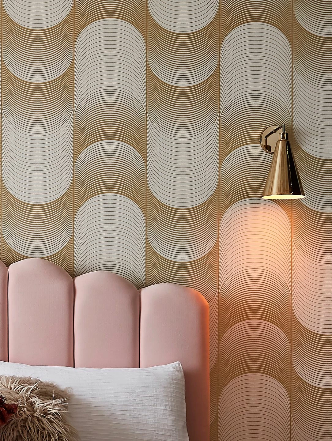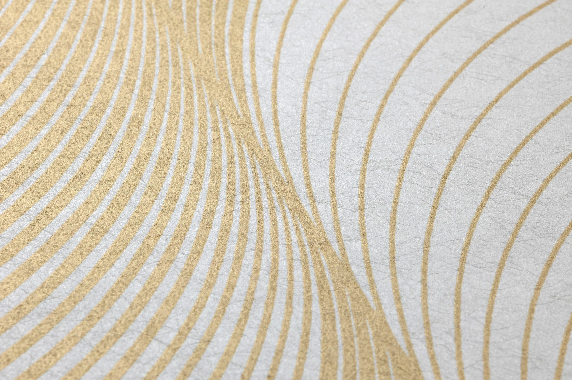 Cremeweiß und Gold – diese Kombination wirkt immer elegant und luxuriös. Die exklusive Designtapete Katsura zaubert mit geschwungenen goldfarbenen Linien ein raffiniertes geometrisches Muster auf den cremeweißen Grund. Die entstehenden Bögen erzeugen einen dreidimensionalen, wellenförmigen Effekt und machen Ihre Wand beinahe schwerelos. Die schimmernde Oberfläche der Vliestapete nutzt das einfallende Licht für eine angenehm helle Raumwirkung.
