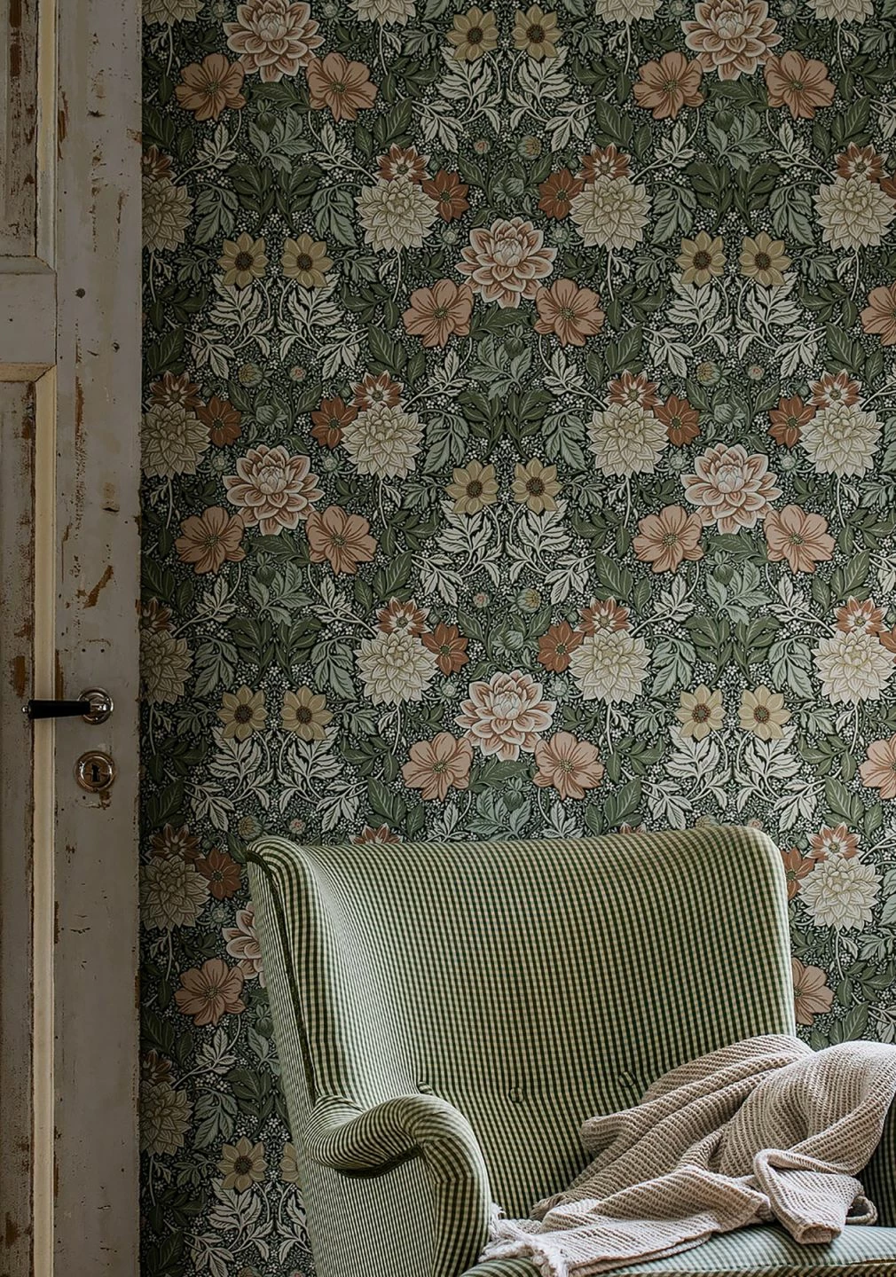 Wie ein großes Blumenbeet voller verschiedener Dahlien wirkt das Muster der Vliestapete „Kerala“. Die großen Blüten in Beige- und Brauntönen harmonieren perfekt mit dem tannengrünen Untergrund, der von kleinen hellen Blümchen zusätzlich belebt wird. Der Leimdruck in Verbindung mit der zugrundeliegenden Symmetrie, in der die Blumen angeordnet sind, bringt einen Hauch von Jugendstil mit und passt ideal zu Möbeln im Retro-Look.