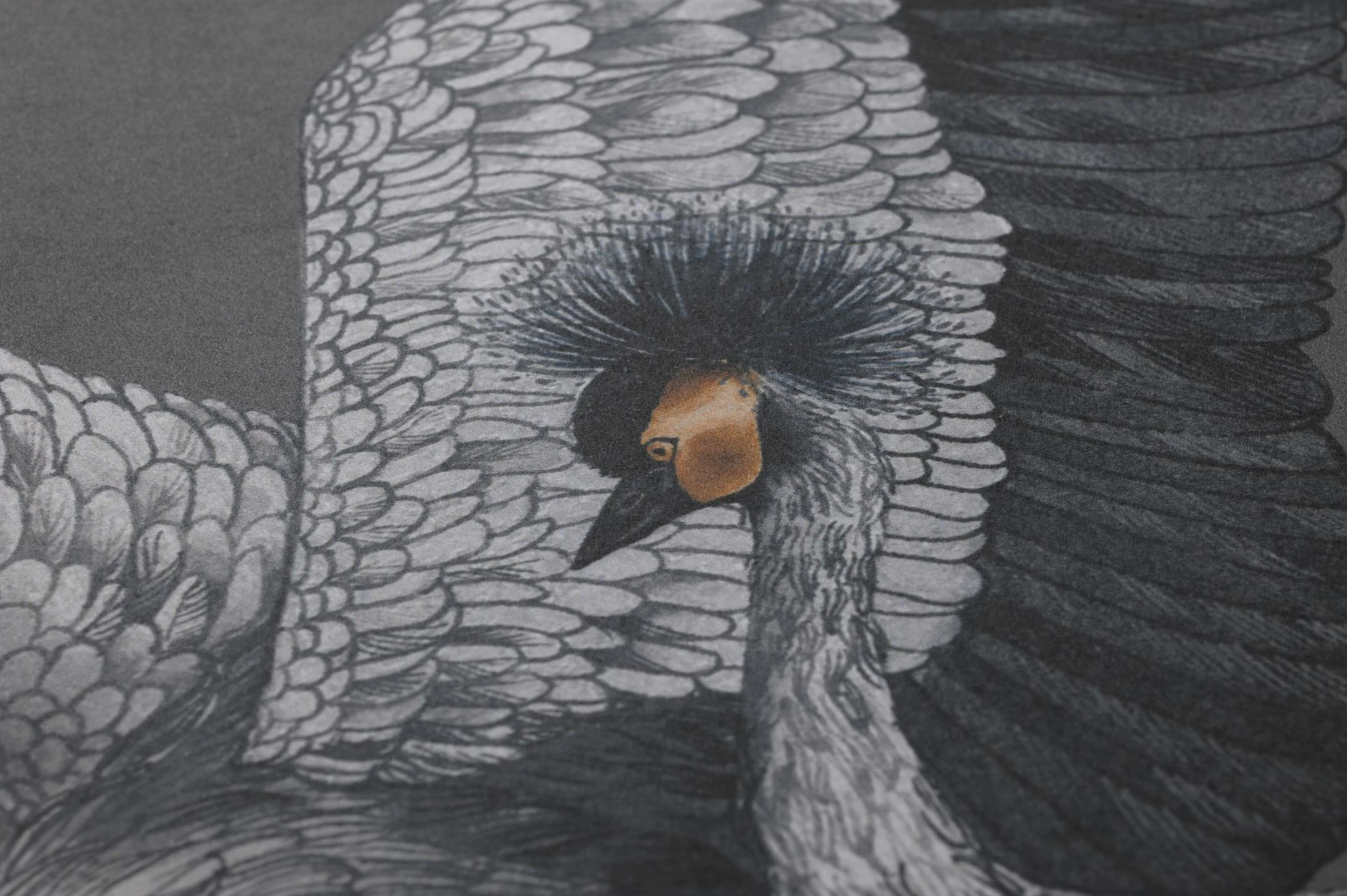 Besonders elegant vermittelt die orientalische Tapete Kimora die asiatische Ästhetik. Auf dem dunkelgrauen Grund sind mit liebevollen Details versehene Kronenkraniche abgebildet. Dazwischen Lotosblumen, teils voll erblüht, teils als heranwachsende Knospen. Ihre charakteristischen Blätter komplettieren das Design. Das Spiel mit den Größenverhältnissen setzt der realistischen Zeichnung der Kraniche und Lotosblumen eine Portion Abstraktheit entgegen und schafft ein reizvolles Spannungsfeld.