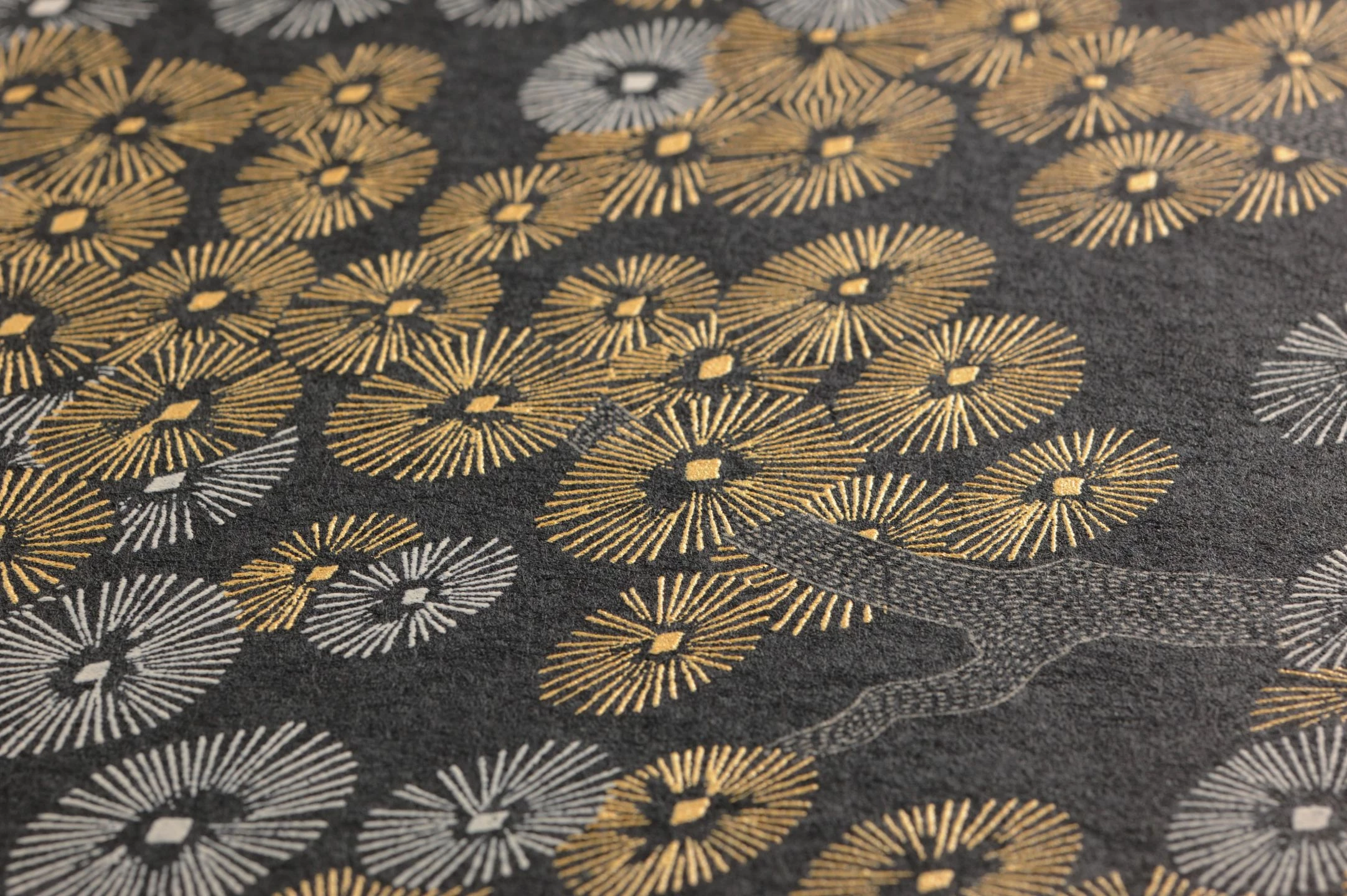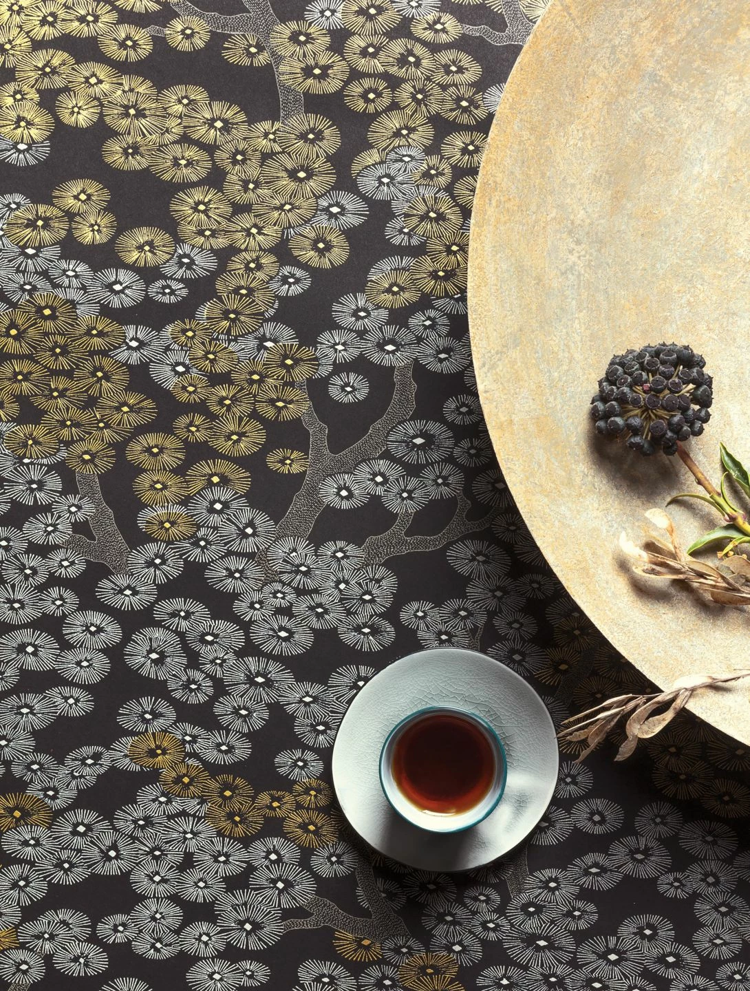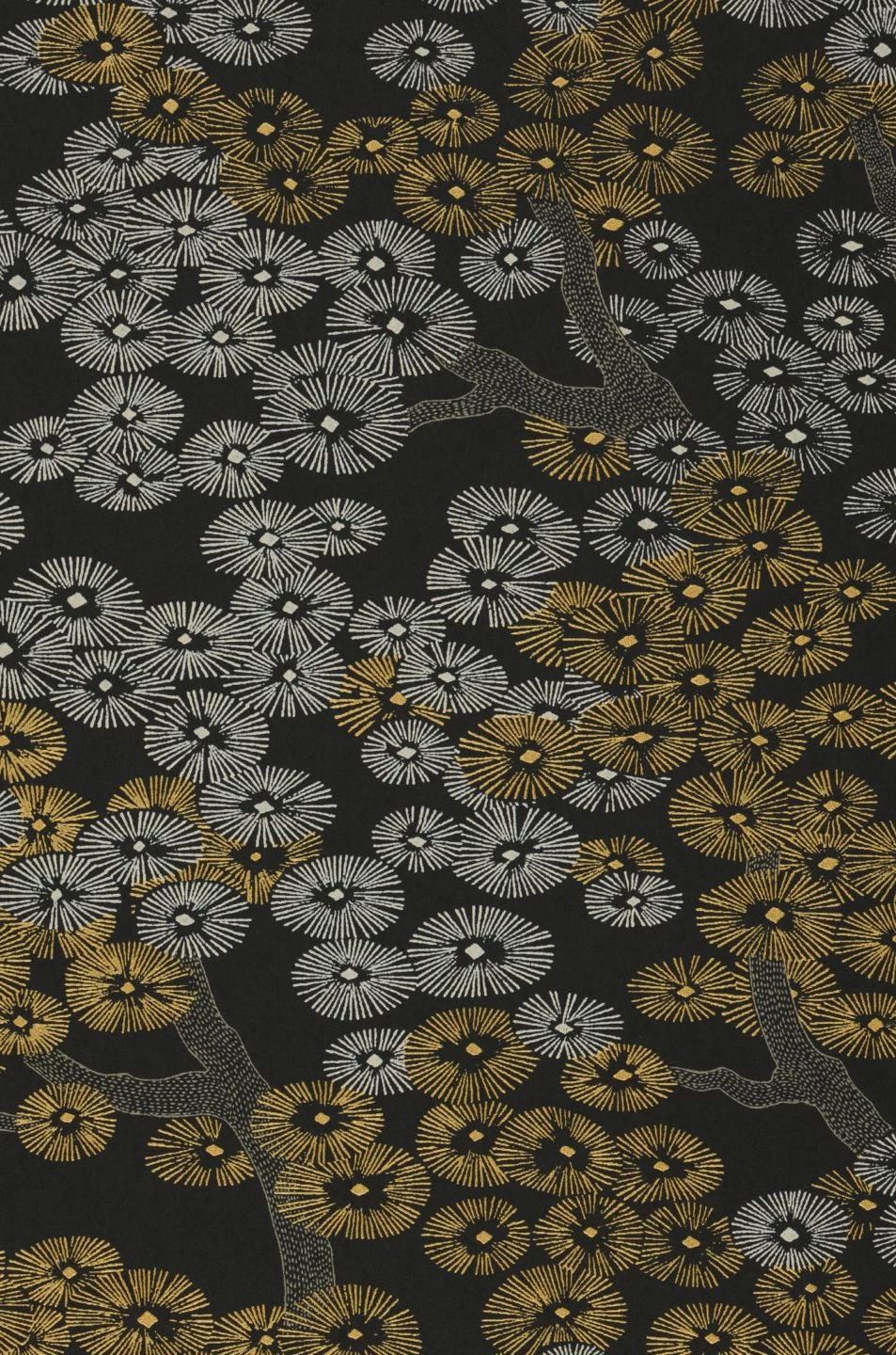 Mattgoldfarben und grauweiß schimmern die filigranen Blüten der Bäume auf der im asiatischen Stil gehaltenen Vliestapete „Kirigami“. Nur durch feine Linien und Farbmuster schafft die Illustration den dreidimensionalen Eindruck zarter runder Blüten und knorriger Zweige. Auf dem tiefschwarzen Untergrund entfalten das Mattgold und das Grauweiß des Musters besondere Leuchtkraft und ergänzen Ihre Einrichtung um einen Hauch von Luxus.