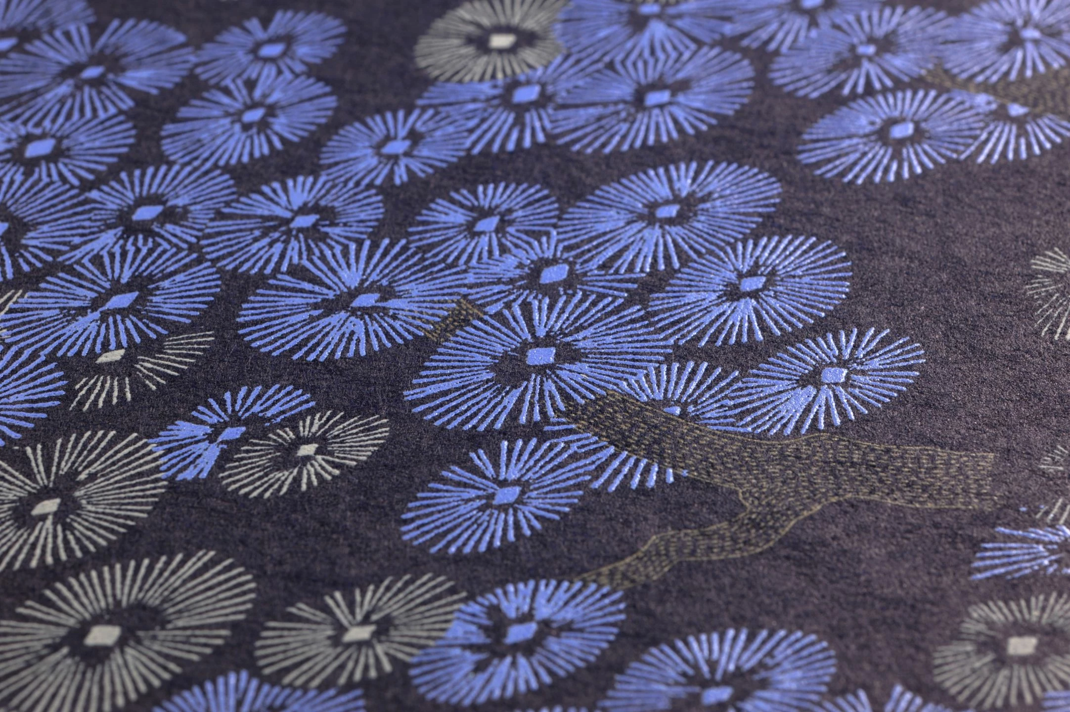 Eine zauberhafte Stimmung im Stil der asiatischen Kunst verbreitet die florale Tapete „Kirigami“. Aus schlichen, zierlichen Pinselstrichen und Schraffuren entstehen blühende Bäume mit faszinierenden Details in der Zeichnung der Rinde und der Blüten. Das schimmernde Perlblau, das Weiß und Blassbraun scheinen auf dem dunklen schwarzblauen Grund zu leuchten. „Kirigami“ ergänzt den asiatischen Einrichtungsstil stimmig und wirkungsvoll.