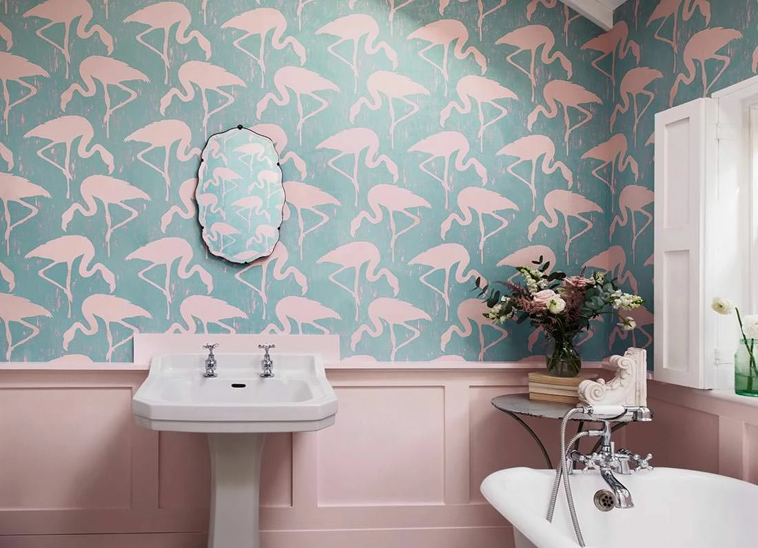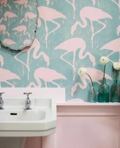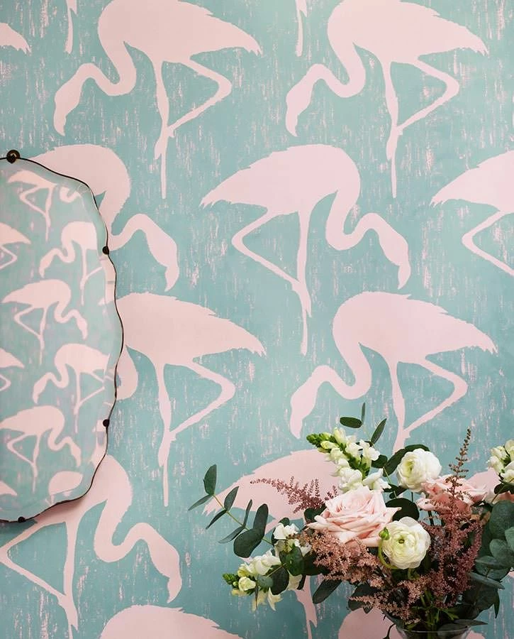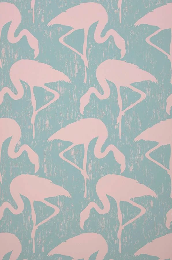 Die Silhouetten graziler Flamingos machen Ihre vier Wände zu einem lebhaften Blickfang. Die faszinierenden Vögel sind in einer natürlichen Pose eingefangen. Ihr zartes Hellrosa verbindet sich mit dem pastelltürkisfarbenen, mit zartrosa Reflexen belebten Untergrund zu einer hellen, exotischen Atmosphäre. Besonders wirkungsvoll kommt die Papiertapete in Verbindung mit weißen Einrichtungselementen oder einer passenden Wandfarbe zur Geltung.