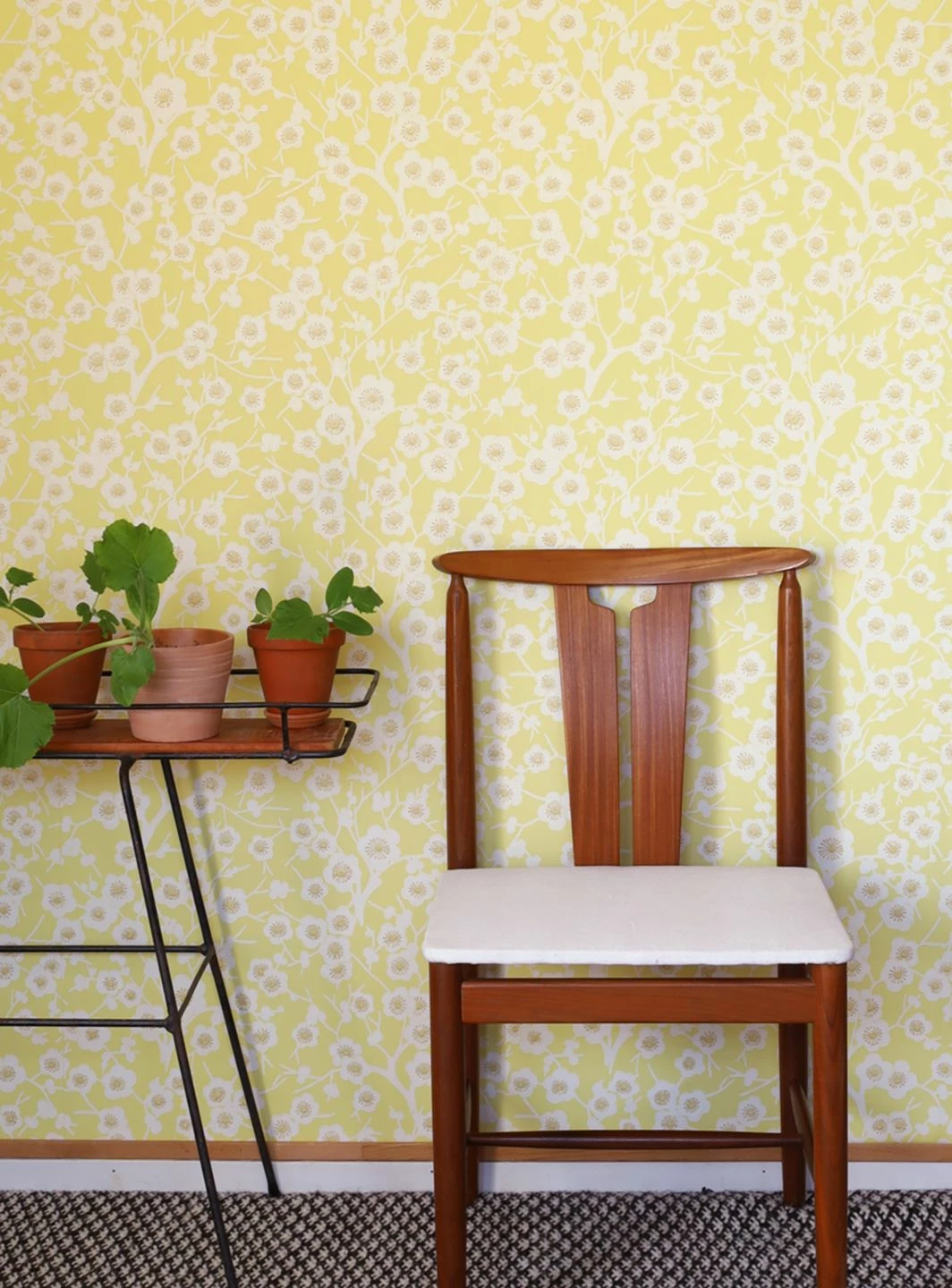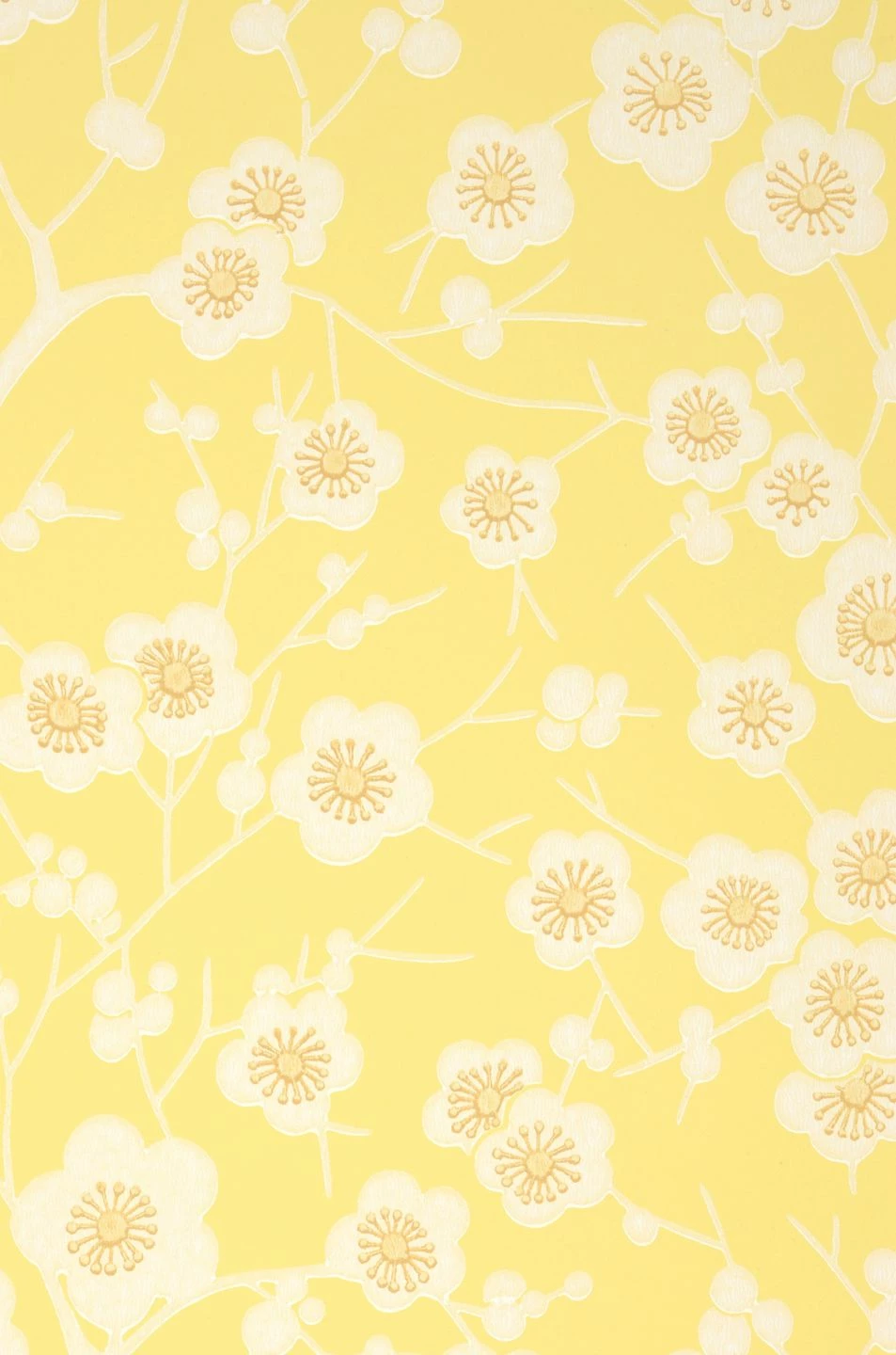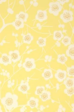 Voller Strahlkraft empfindet Laila die Jahreszeit der Kirschblüte nach. Weiße, stilisierte Kirschblüten, großflächig im attraktiven Leimdruck aufgetragen, mit beigefarbenen Staubgefäßen sitzen an zarten Zweigen. Der hellgelbe Untergrund steht für den wärmenden Sonnenschein des Frühlings, der die Kirschblüten dazu bringt, sich zu öffnen. Eine Tapete, die auch an wolkenverhangenen Tagen gute Laune verbreitet.