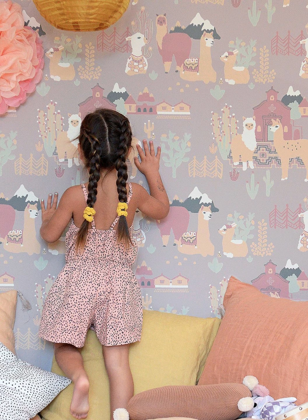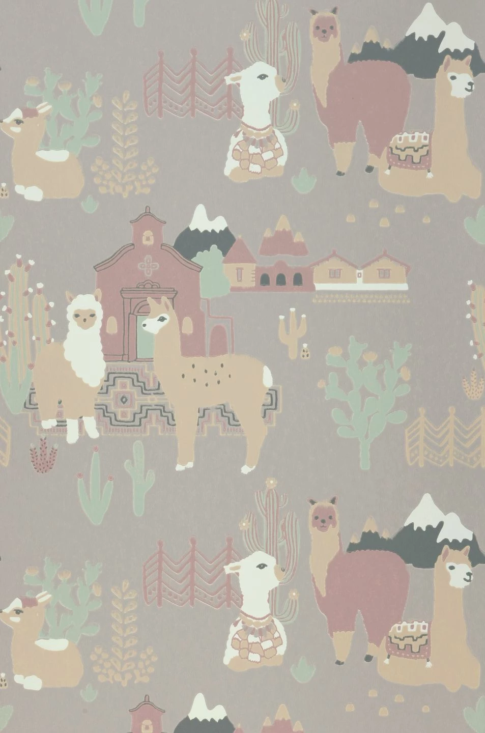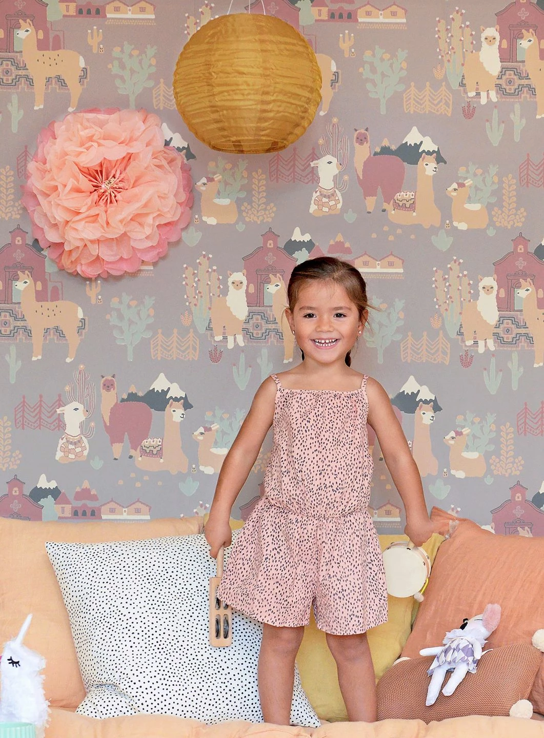 Große und kleine Lamas mit ihren freundlichen Gesichtern und dem kuscheligen Fell bevölkern diese tolle Kinderzimmertapete von Majvillan. In verschiedenen kleinen Szenen nimmt die Tapete die Bewohner des Zimmers mit auf eine abenteuerliche Reise in die südamerikanische Heimat der Tiere. Die hellen Farbtöne – Rotviolett und Blassorange, Blassgrün und Anthrazit auf neutralem grauviolettem Grund – machen das Kinderzimmer zu einem fröhlichen, interessanten Ort.