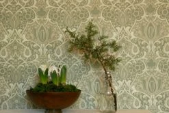 Jeder Millimeter der Papiertapete Lamine ist mit einem komplexen Jugendstil-Muster aus stilisierten Blüten, Ranken und abstrakten Ornamenten ausgefüllt. In der Fülle der verschiedenen Formen bietet der enge Farbraum Ruhe und Zusammenhalt: Gelbgrau, Olivgrün und Grünweiß auf dem grauolivfarbenen Grund verleihen der Leimdruck-Papiertapete einen nostalgischen Touch. Ein gemütliches Wohn- oder Schlafzimmer mit Retro-Möbeln gewinnt mit Lamine an Charakter.