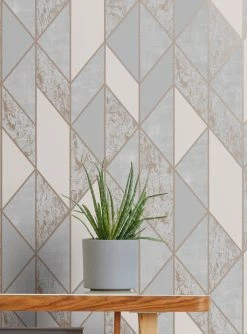 Modernes Art Deco entdeckt sich mit dieser geometrischen Tapete in Grautönen und Rosenholz neu. Der schimmernde Untergrund verhilft dem bewegten dreidimensionalen Muster zu mondäner Eleganz, die sich auch in den marmorierten Flächen widerspiegelt. Das fühlbare Relief der Vinyltapete unterstreicht den hochwertigen Charme.