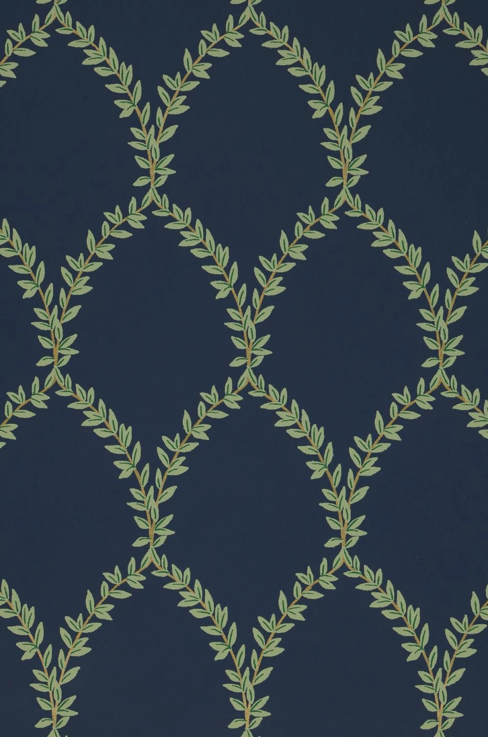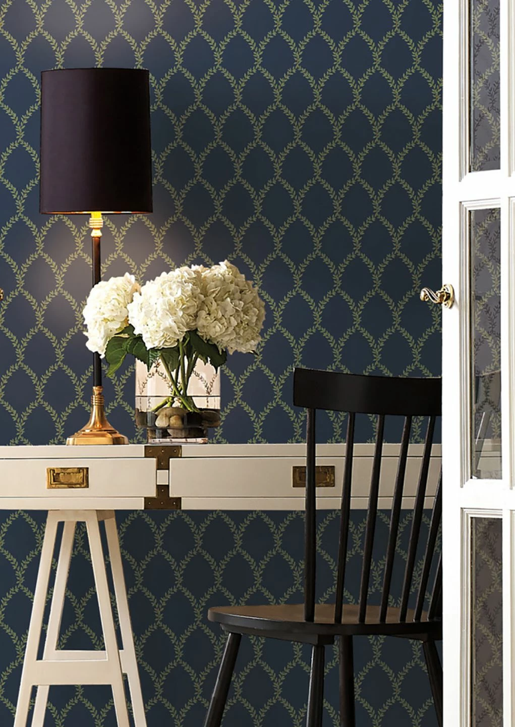 Kränze aus feinen Blättern und Zweigen finden sich zu einem zarten Muster zusammen und geben der Vliestapete ihre Struktur. Das dunkle Blau des Untergrunds strahlt Ruhe aus und bildet den perfekten Hintergrund für die perlgoldenen Highlights der Blattkränze. Edel und hochwertig ist die Wirkung dieser Tapete.