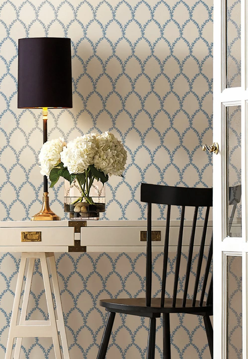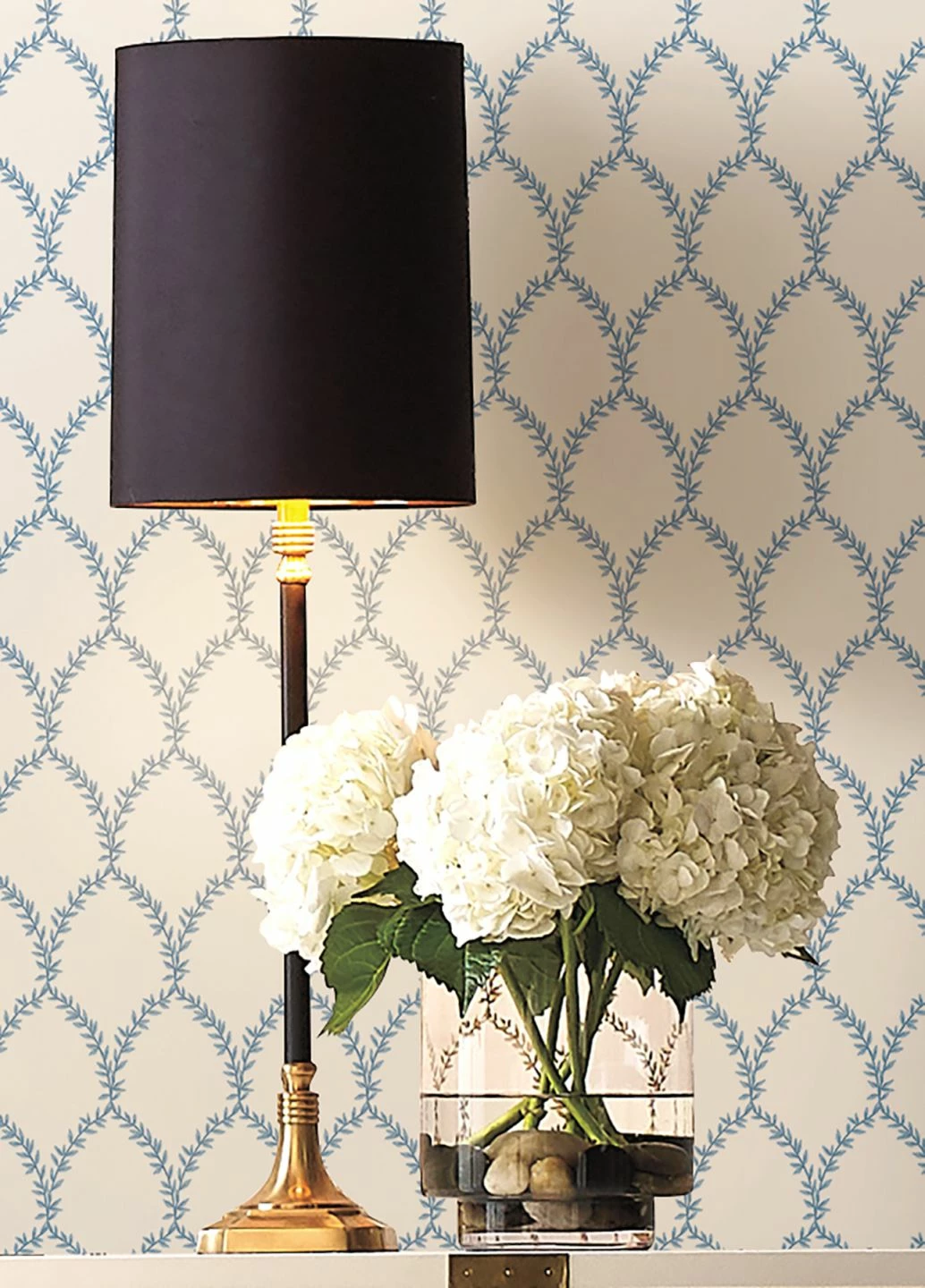 Zart und filigran wirken die aus graublauen und pastellblauen Blättern gewundenen Kränze, die sich auf dieser Vliestapete zu einem feinen Muster verbinden. Die Blautöne auf weißem Grund bringen Frische und Helligkeit in jeden Raum. Kombiniert mit weißen Möbeln oder im Landhaus-Stil, entfaltet die Tapete ihre ganze Strahlkraft.