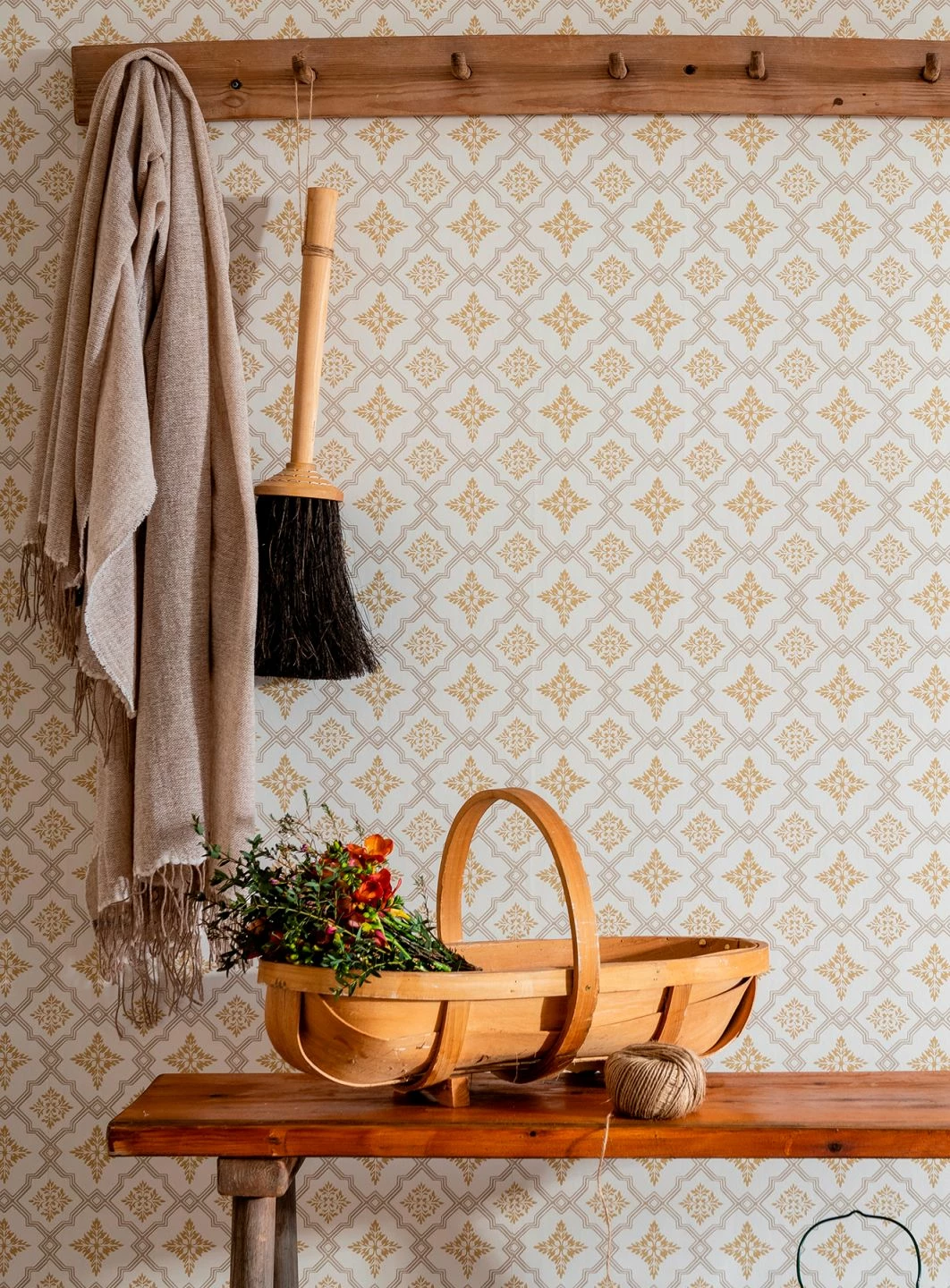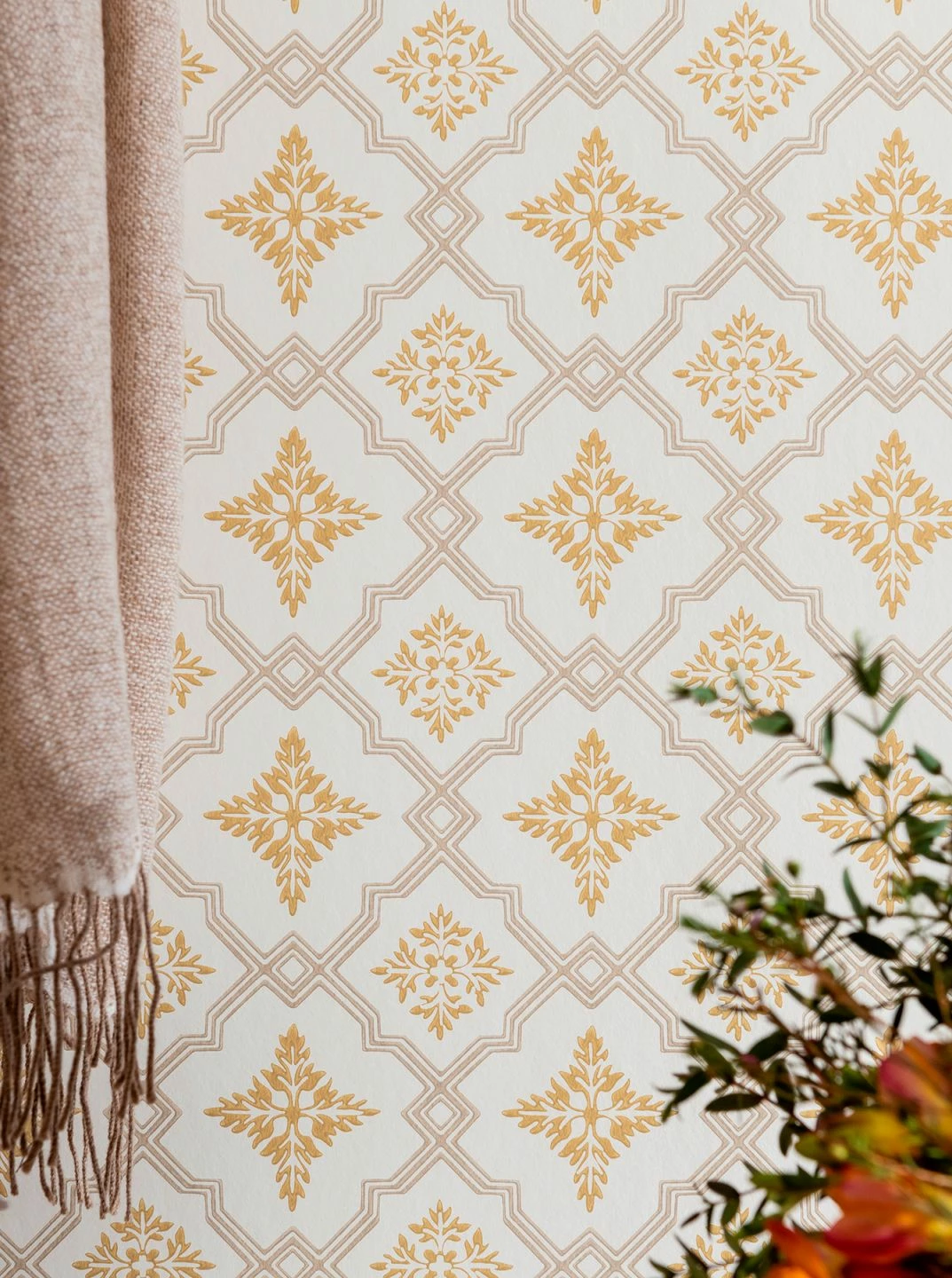 Graubeige und Ockergelb strahlen kombiniert eine ungeheuer fruchtige Note aus, die an einen ländlichen Obstgarten erinnert. Von der Natur und historischen Vorlagen inspiriert sind die Musterelemente, die sich aus Blattwerk und geometrischen Elementen zusammensetzen. Die ideale Tapete für nostalgische Eingangsbereiche, ein Country-Schlafzimmer oder die Vintage-Landhausküche.