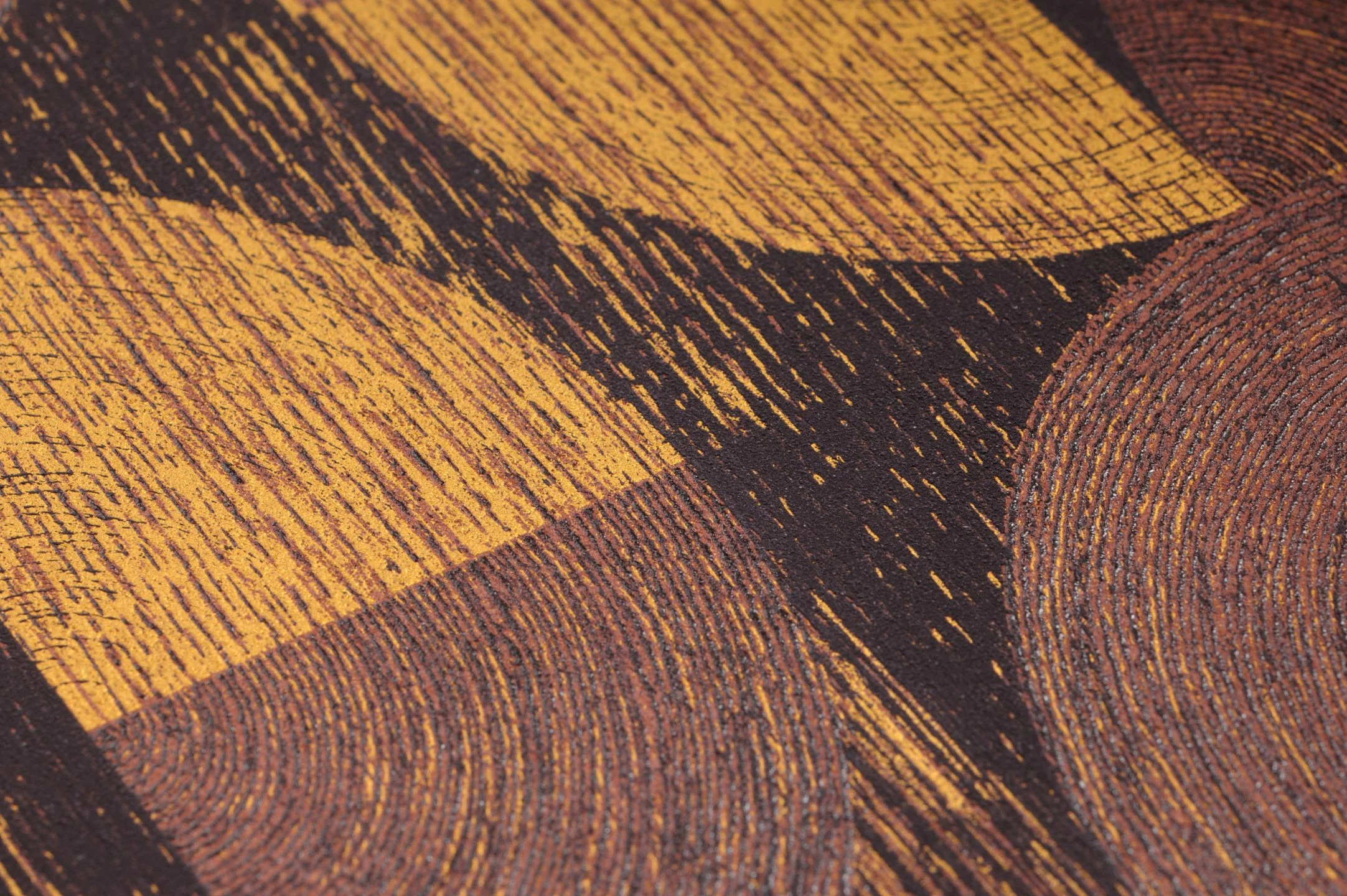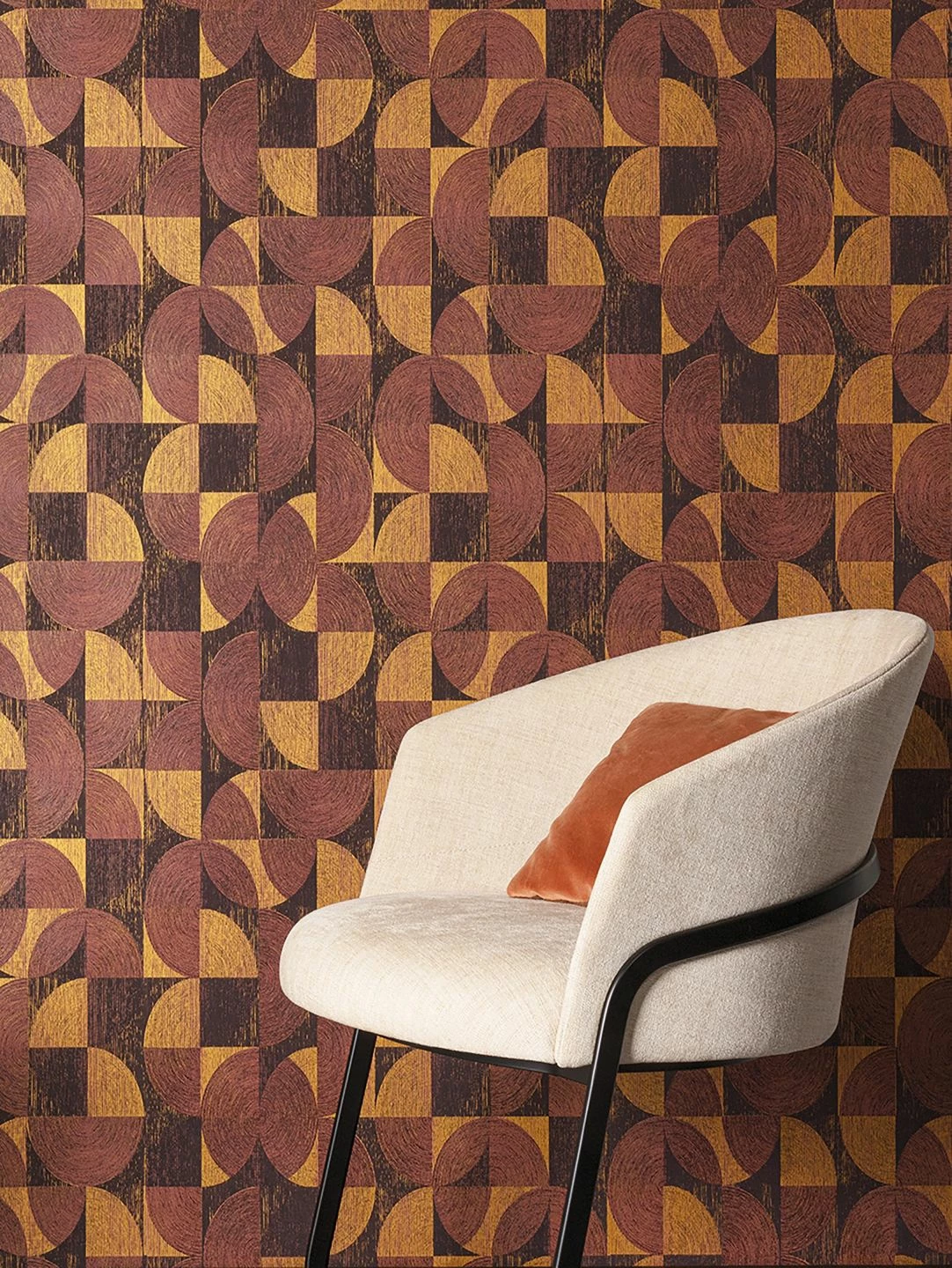 Mit ihren starken, warmen Brauntönen und Gold und dem charaktervollen geometrischen Design aus schraffierten Halb- und Viertelkreisen lockert Vliestapete Libertas die glatte Fläche Ihrer Wand effektvoll auf. Die ausdrucksstarken Farben betonen Sie mit den entsprechenden Holztönen oder hellen Naturtönen besonders wirkungsvoll. Zeitlos aktuell, dynamisch und anregend wirkt die Tapete an Ihren vier Wänden.