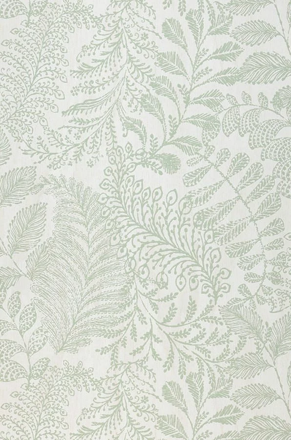 Verträumte, fedrig leichte Blätter schmiegen sich nahezu aneinander und bilden dekorative, geschwungene Linienformen. Der cremeweisse Tapetengrund lässt das blassgrüne Muster mit starkem Bezug zu floralen Jugendstilornamenten weich und schemenhaft erscheinen. Diese grüne Romantik schmeichelt dem Raum ungemein.