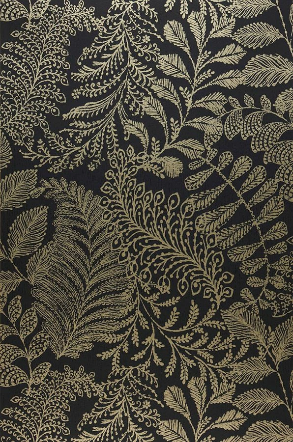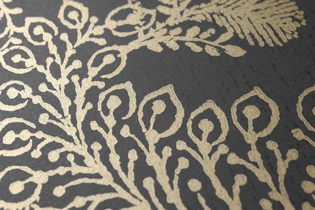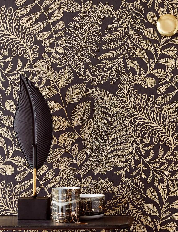 Der Jugendstil war meisterliches Vorbild dieser eindrucksvollen Blattornamentik, die ihre geschwungenen Formen wie selbstverständlich miteinander vernetzt. Mit mattem Anthrazit als Grundfarbe und filigran gezeichneten Blättern in schimmerndem Perlgold entfaltet sich zugleich eine mondäne Opulenz im Raum.