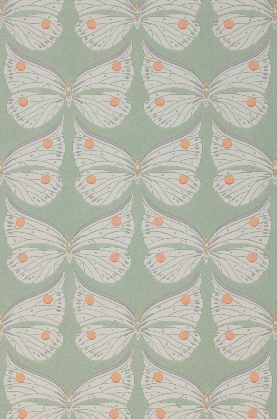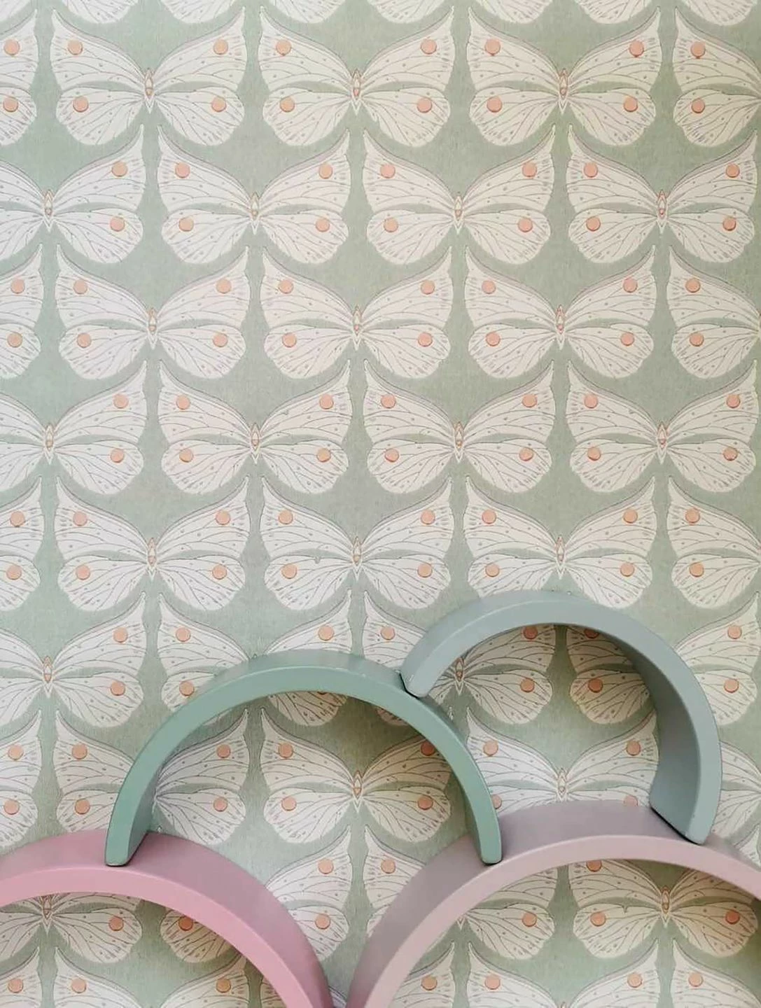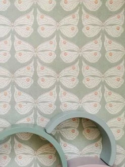 Auf der Papiertapete Lisabet entfalten zahllose Schmetterlinge ihre ausladenden, geschwungenen Flügel. Das Weiß der Flügel mit ihrer blassvioletten und hellorangefarbenen Zeichnung bildet eine freundliche, angenehme Farbkombination mit dem Blassgrün des Untergrunds. Sowohl in der Farbgebung als auch im Stil der Illustration hat die Tapete einen Retro-Schick, der besonders gut zu echten Holzmöbeln passt.