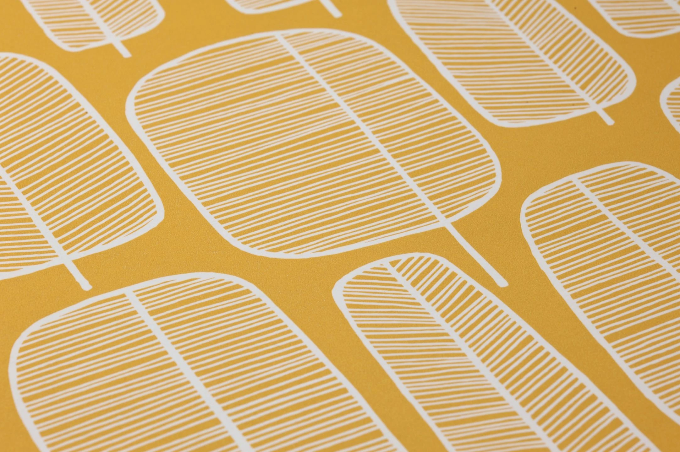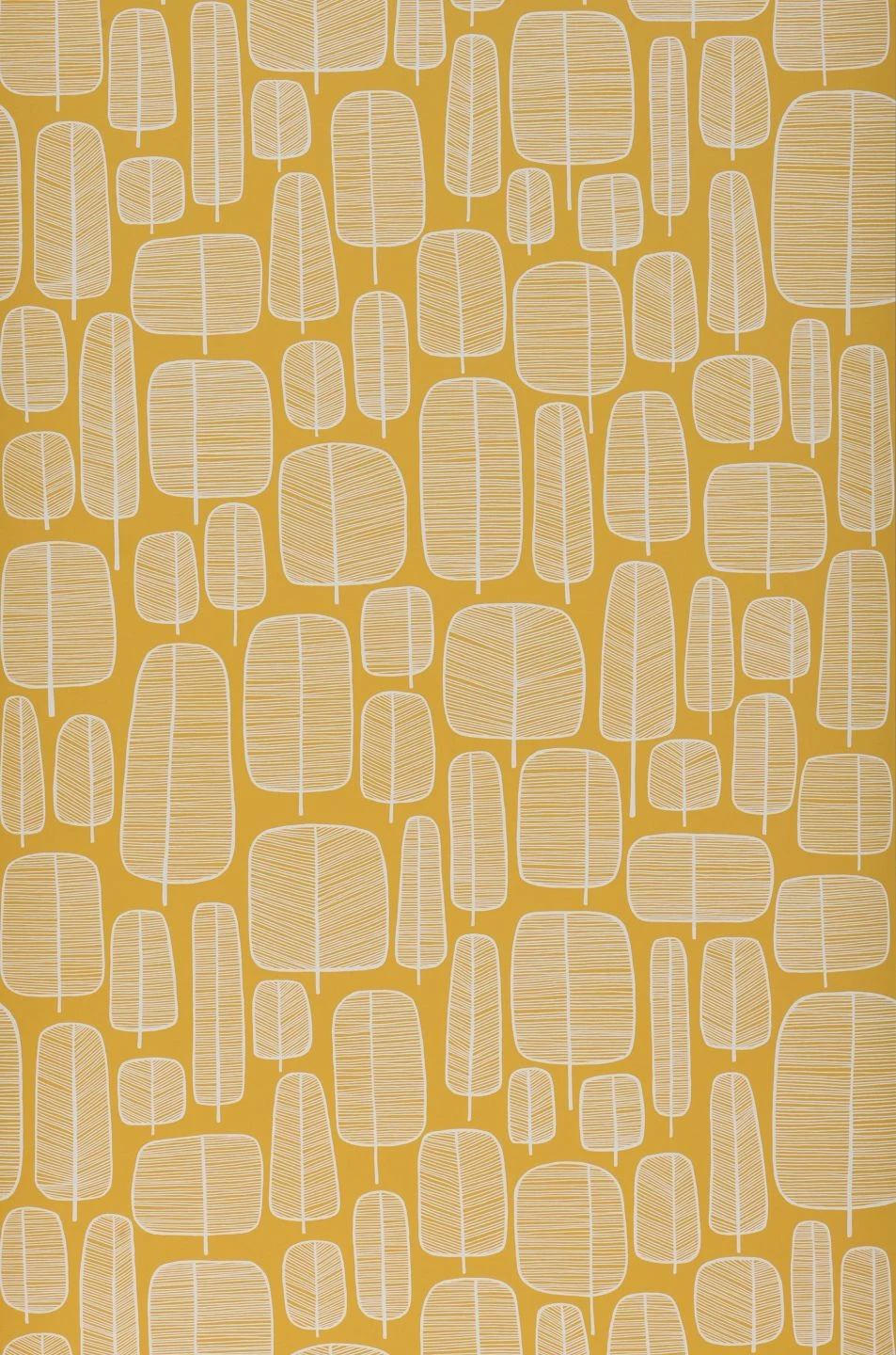 Sonnig leuchtendes Goldgelb bildet den Hintergrund eines stilisierten lichtdurchfluteten Waldes, der durch einfache Schraffur angedeutet wird. Die verschiedenartigen Formen der Bäume stehen für die Vielfalt der Natur und schaffen doch durch die schlichte Zeichentechnik ein geschlossenes Gesamtbild. Die hellen, fröhlichen Farben sorgen für sommerliche Atmosphäre.