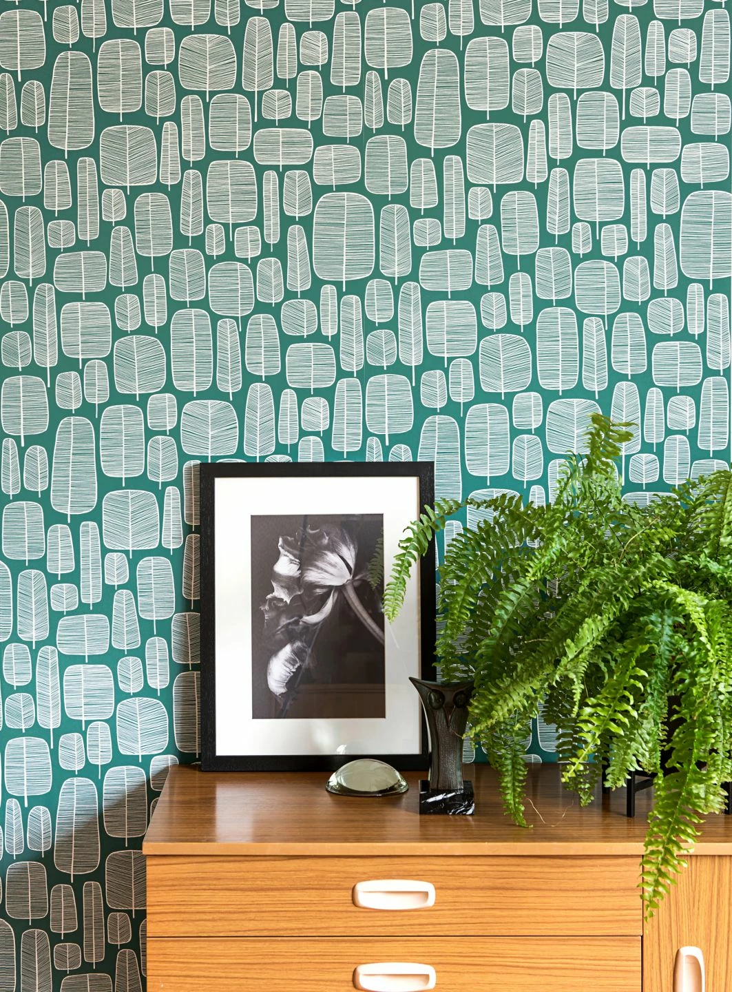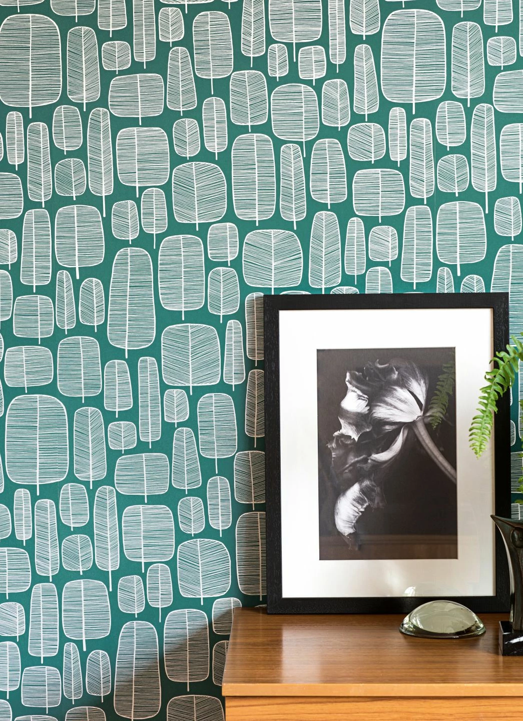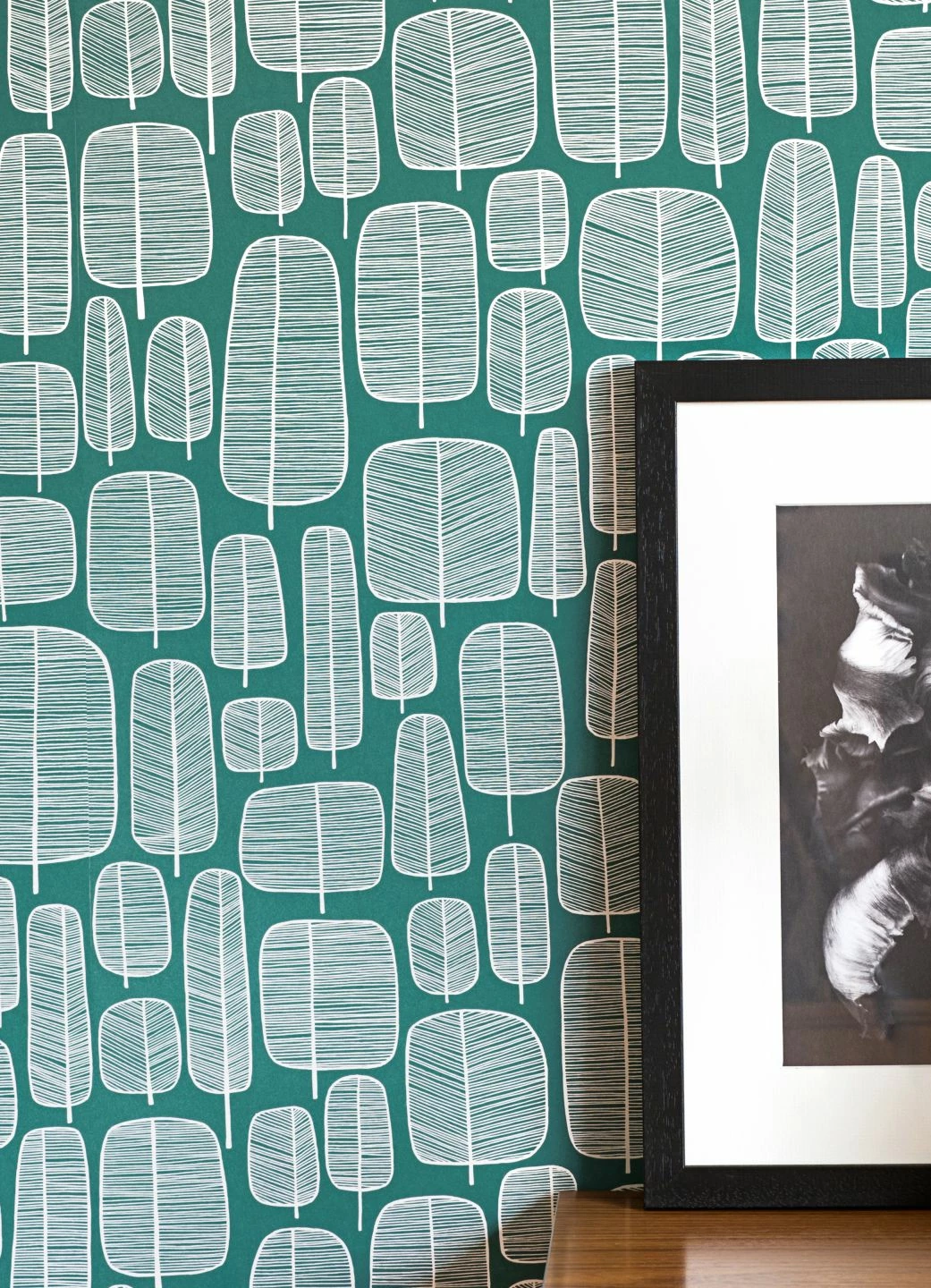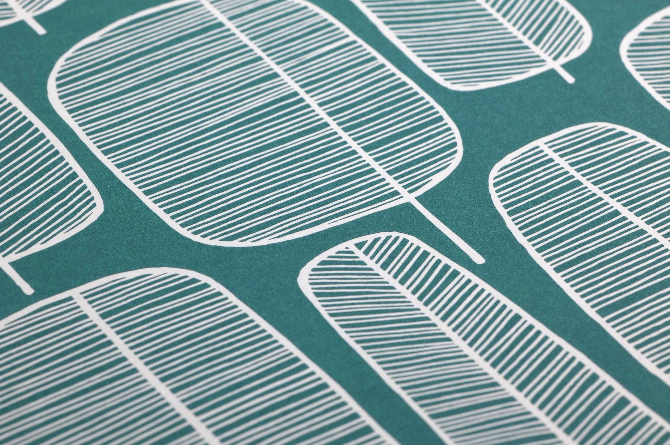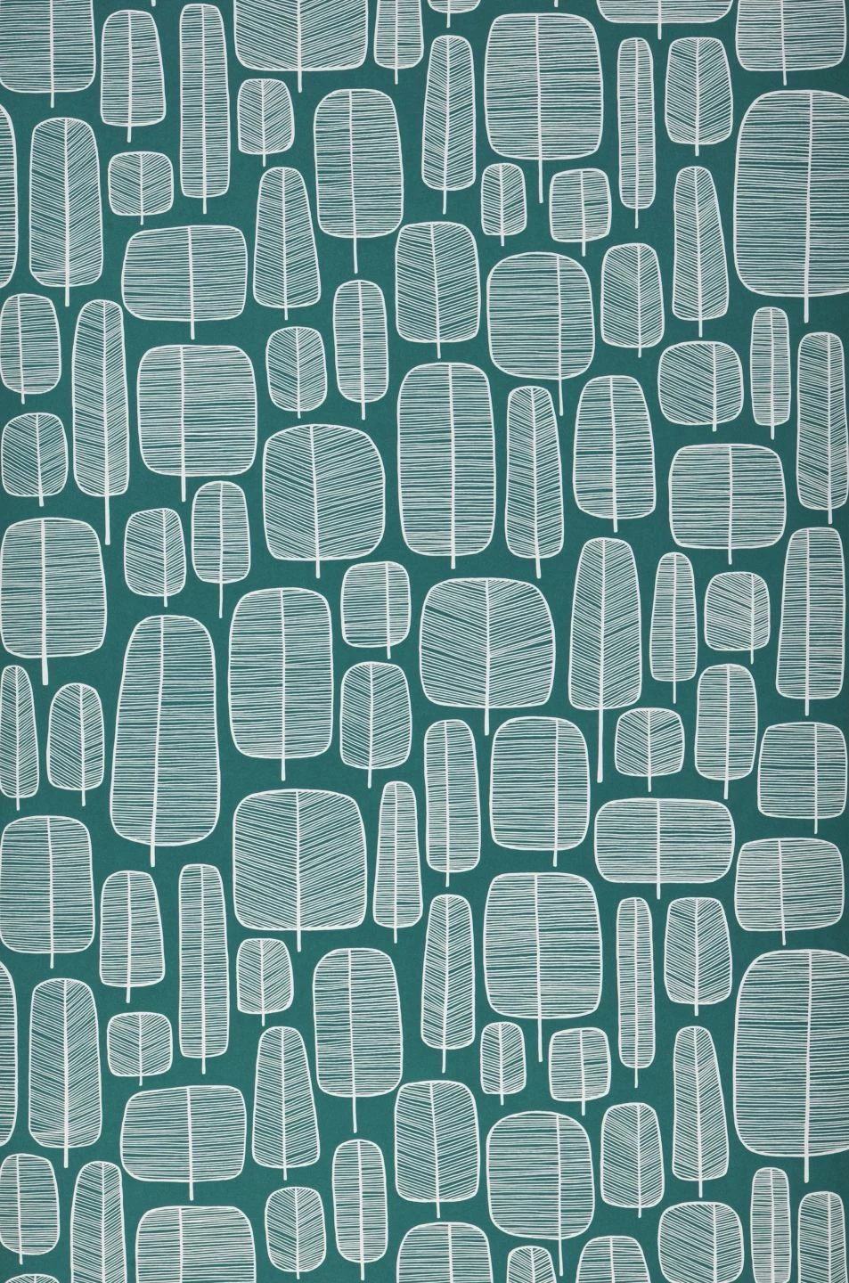 Ganz unkompliziert kommen die stilisierten Bäume daher: Mit wenigen Umrissen und dünnen Schraffierungen in Weiß auf opalgrünem Grund bilden sie einen ganzen Wald. Die verschiedenen Formen der Baumkronen deuten die Artenvielfalt eines Mischwaldes an, ohne zu viel ins Detail zu gehen. Die Kombination der Farben und der wie hingekritzelt wirkenden Formen macht die Tapete leicht und unaufdringlich wie den skandinavischen Einrichtungsstil.