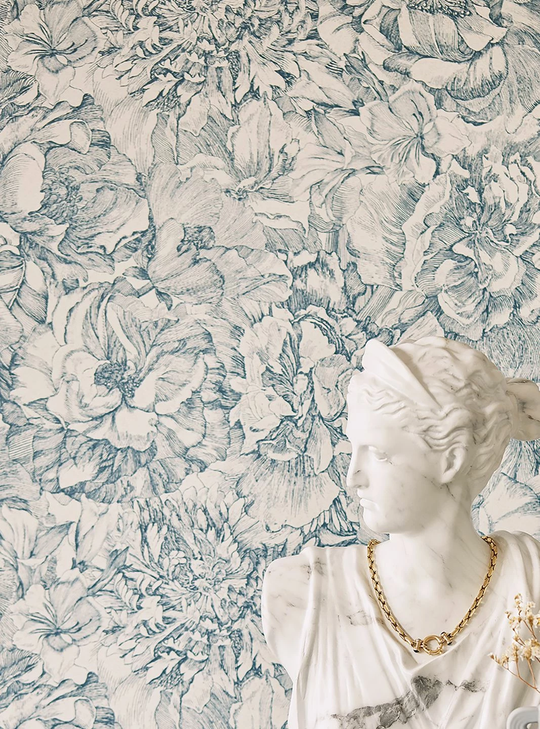 Eine Tapete wie ein überdimensionaler Kupferstich nimmt Sie mit auf eine künstlerische Zeitreise. Die großen Blumen und Blüten mit ihren phantastischen Formen setzen sich komplett aus feinen Linien und ausdrucksstarken Schraffuren zusammen und schaffen einen Eindruck von Lebhaftigkeit, Fülle und Bewegung. Mit weißen Möbeln, im Retro-Design oder modern, kreieren Sie ein stimmiges Gesamtbild oder eine reizvolle Spannung.