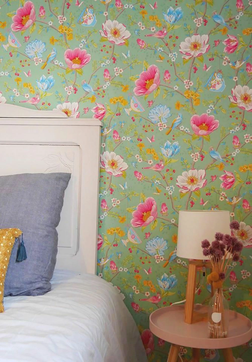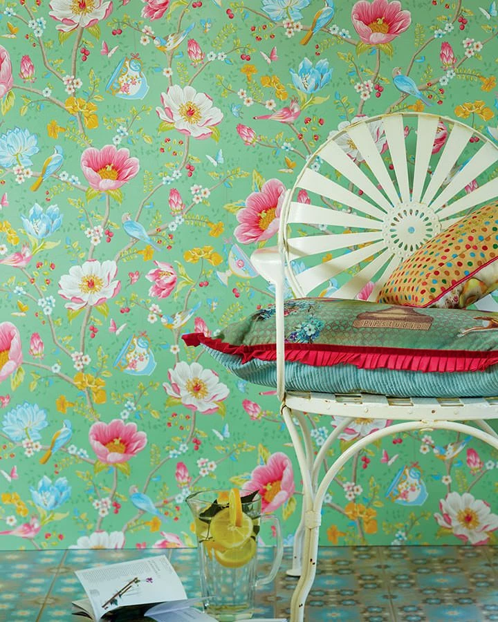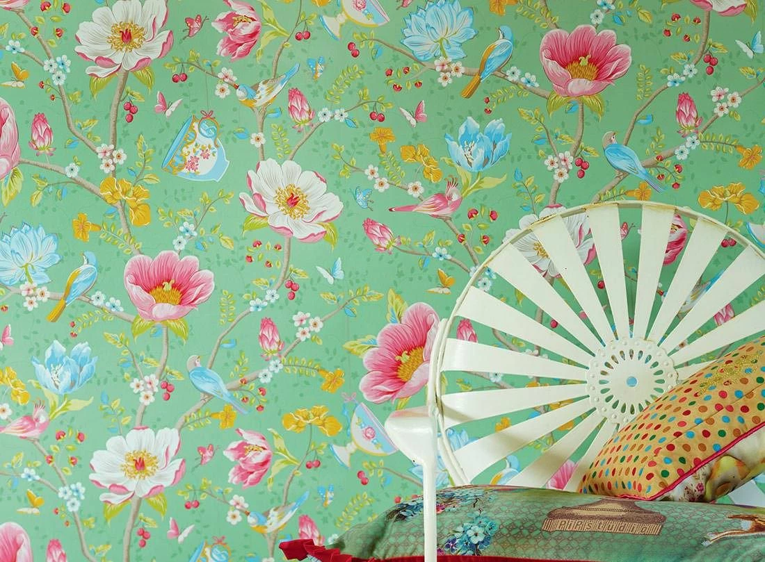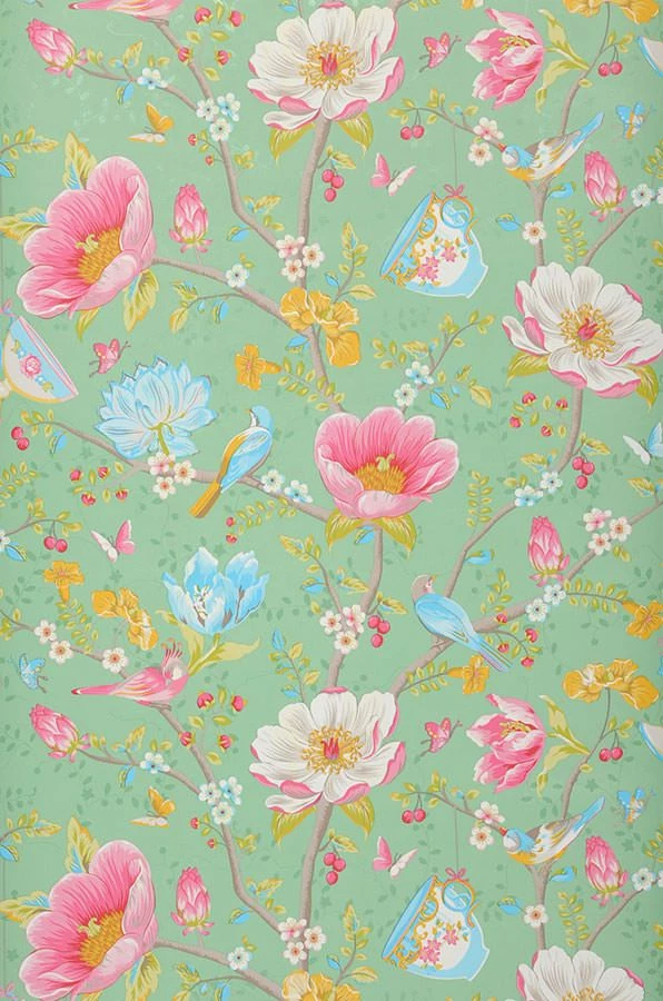 Zwischen der blumigen Vielfalt hängen Tassen an Zweigen, kleine Vögel und Schmetterlinge bewundern die Farbenpracht. Wer würde sich in dieser pastellgrünen Fantasiewelt nicht wohl fühlen?