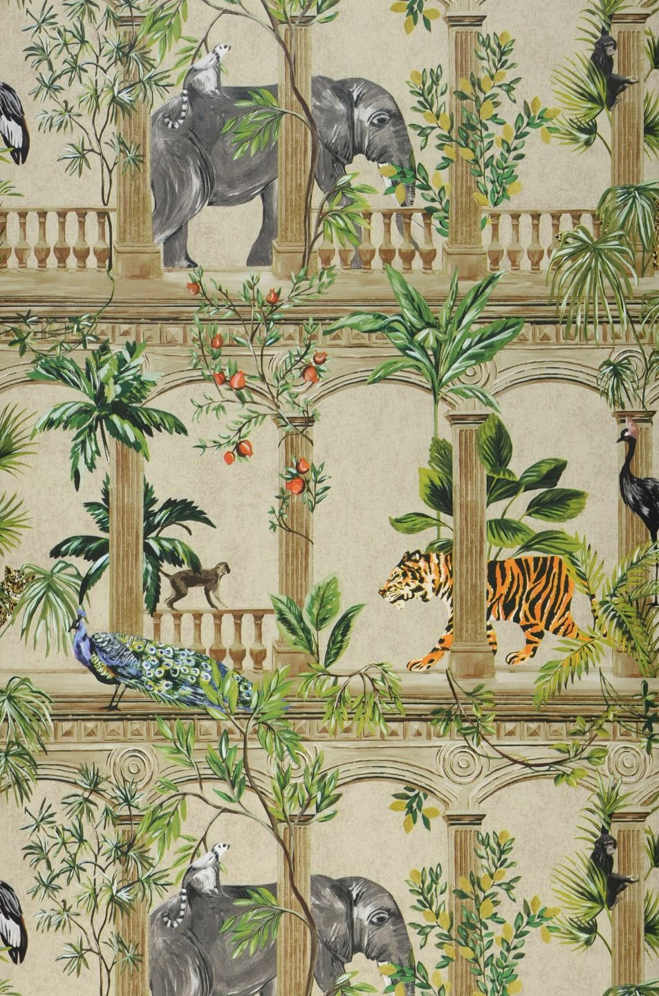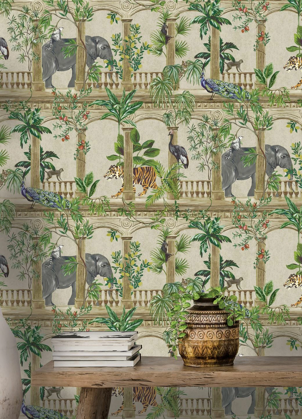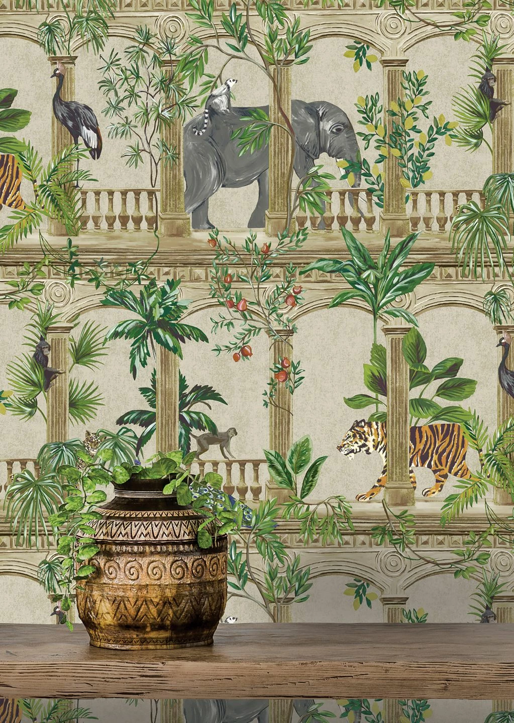 Als würden Sie aus dem Fenster eines orientalischen Palasts blicken: Zwischen Säulen und Balustraden hindurch fällt Ihr Blick auf exotische Pflanzen und Tiere. Elefanten und Tiger, Palmen, tropische Blattpflanzen, Pfauen, Kraniche und Äffchen bevölkern den Garten des Palasts und sind an Ihren vier Wänden ein echter Hingucker. Mit Möbeln im dunklen Kolonialstil und exotischen Deko-Elementen schaffen Sie ein faszinierendes Ensemble.