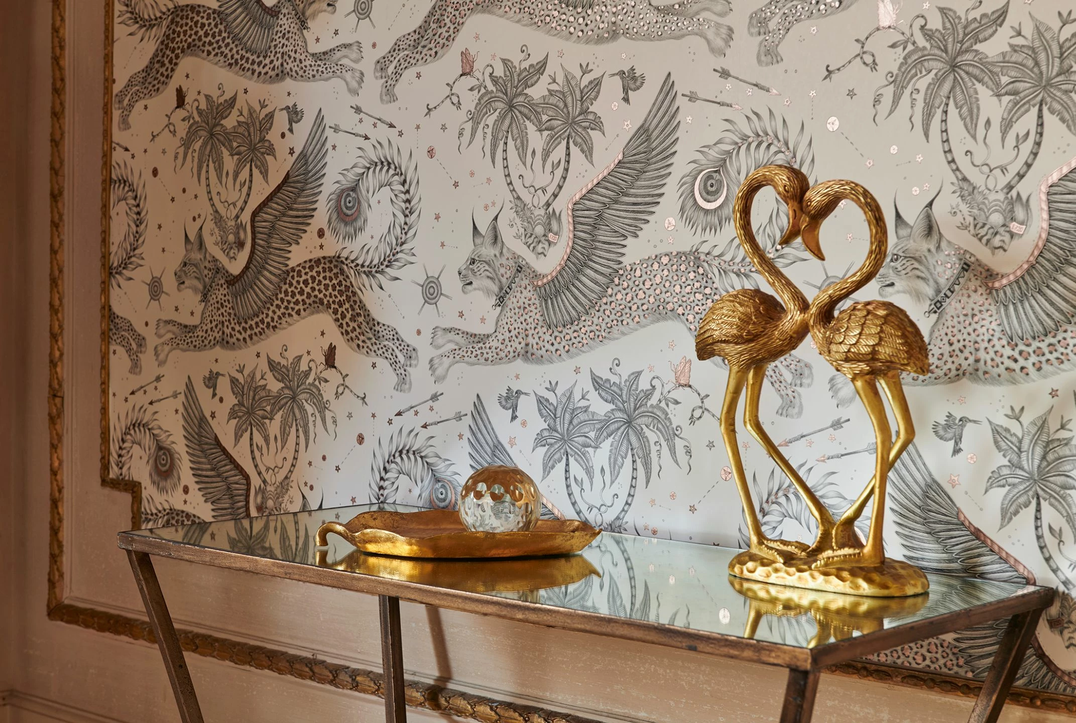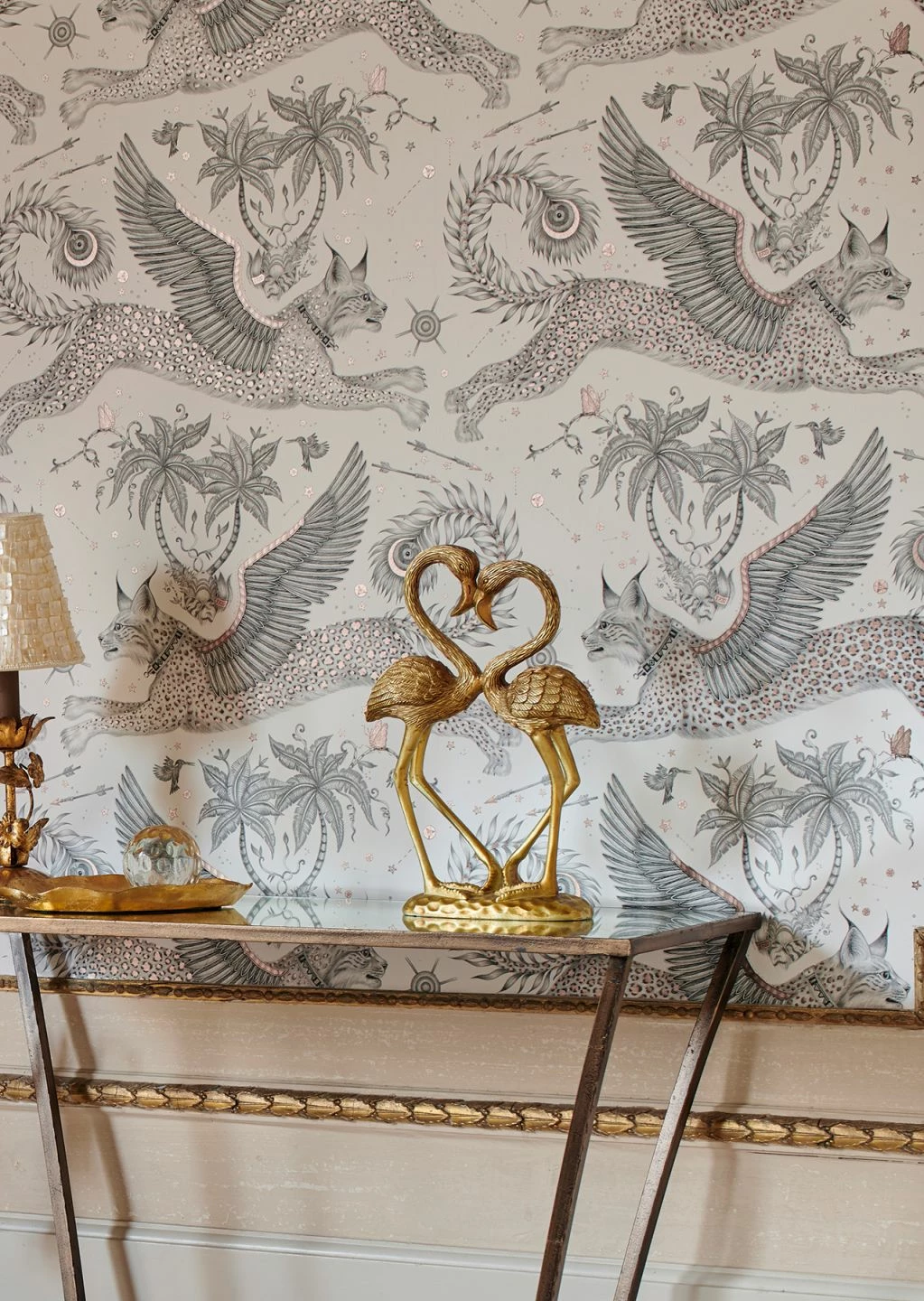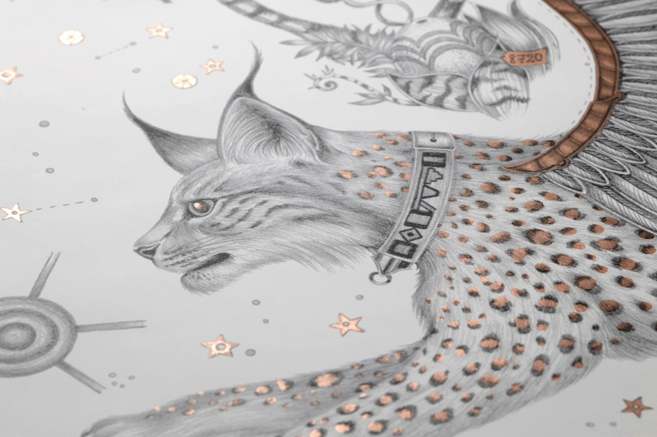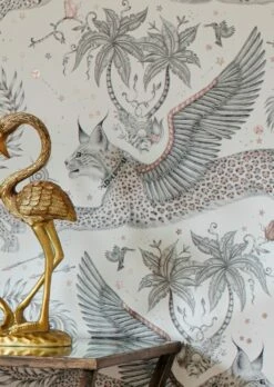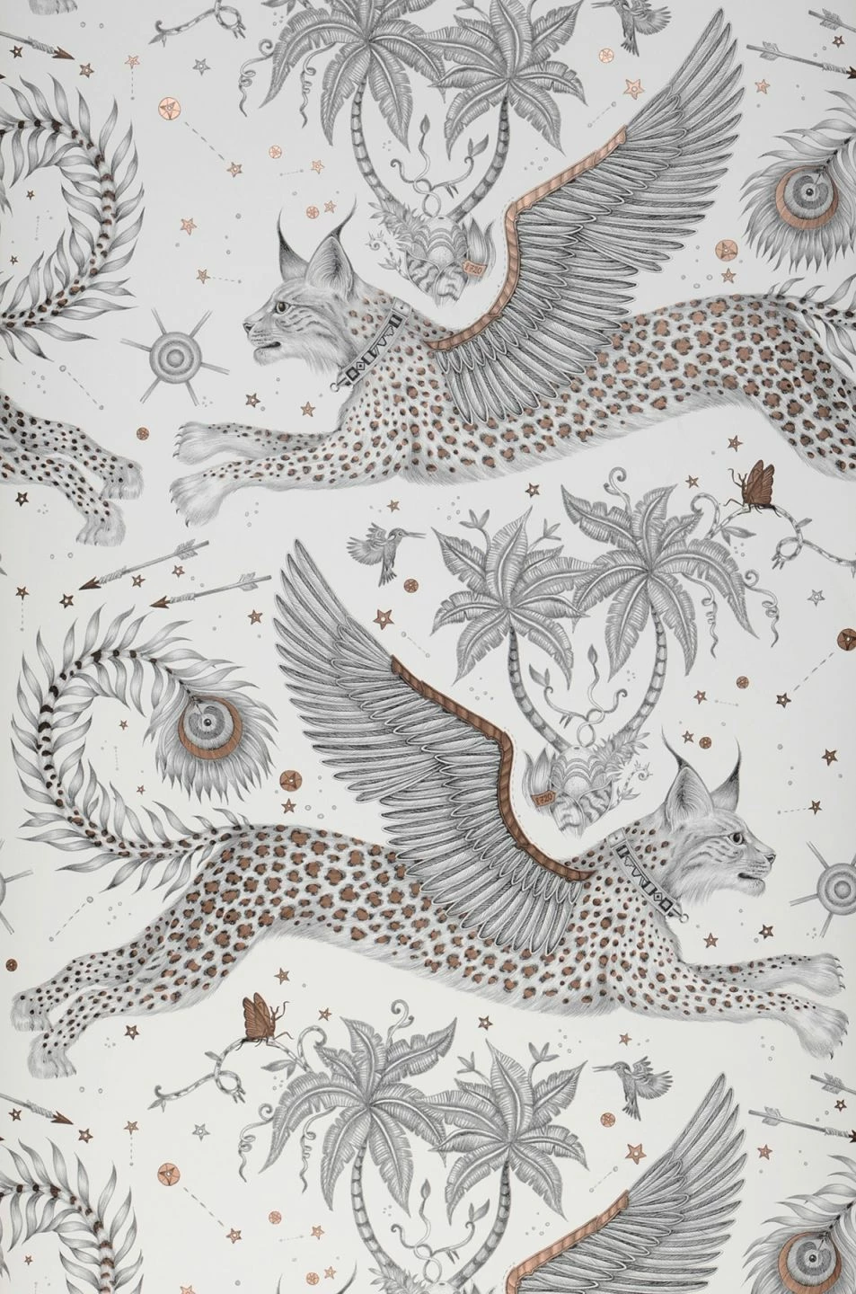 Mit großer Liebe zum Detail sind die Fabelwesen auf dieser phantastischen Vliestapete dargestellt. Luchse mit Pinselohren und geflecktem Fell, deren Schwänze wie Pfauenfedern geformt sind, scheinen auf großen gefiederten Schwingen zu fliegen. Sie schweben inmitten einer Traumwelt aus Palmen und Sternen, Pfeilen und Vögeln. Die Grautöne mit roségoldenen Glanzlichtern geben der Tapete einen modernen Look. (Raphael)