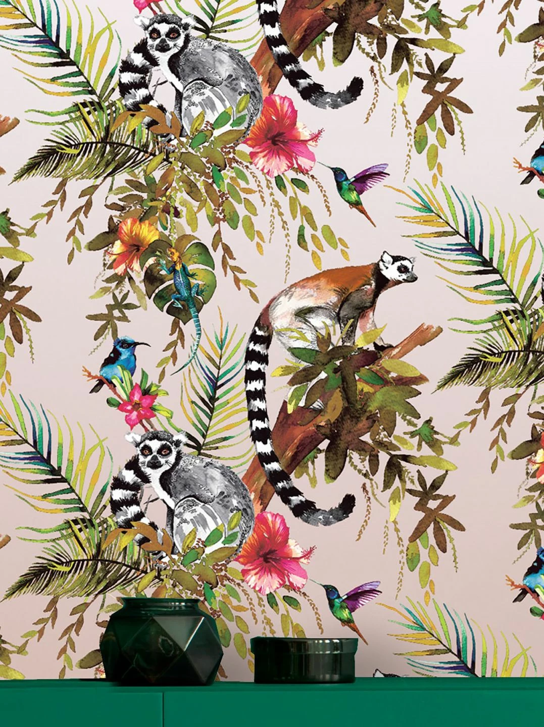 Kilometerlange Alleen mit mächtigen Baobabäumen, exorbitante Felswände, tropischer Regenwald, exotische Tiere. Die unbändige Schönheit der ältesten Insel im Indischen Ozean erblüht mit dieser ausgefallenen Motivtapete auch in den eigenen vier Wänden. Schimmerndes Rosenholz bildet den aufregenden Fond für die spritzigen Musterfarben Blau, Braun, Gelb, Rosa und Grüntöne.