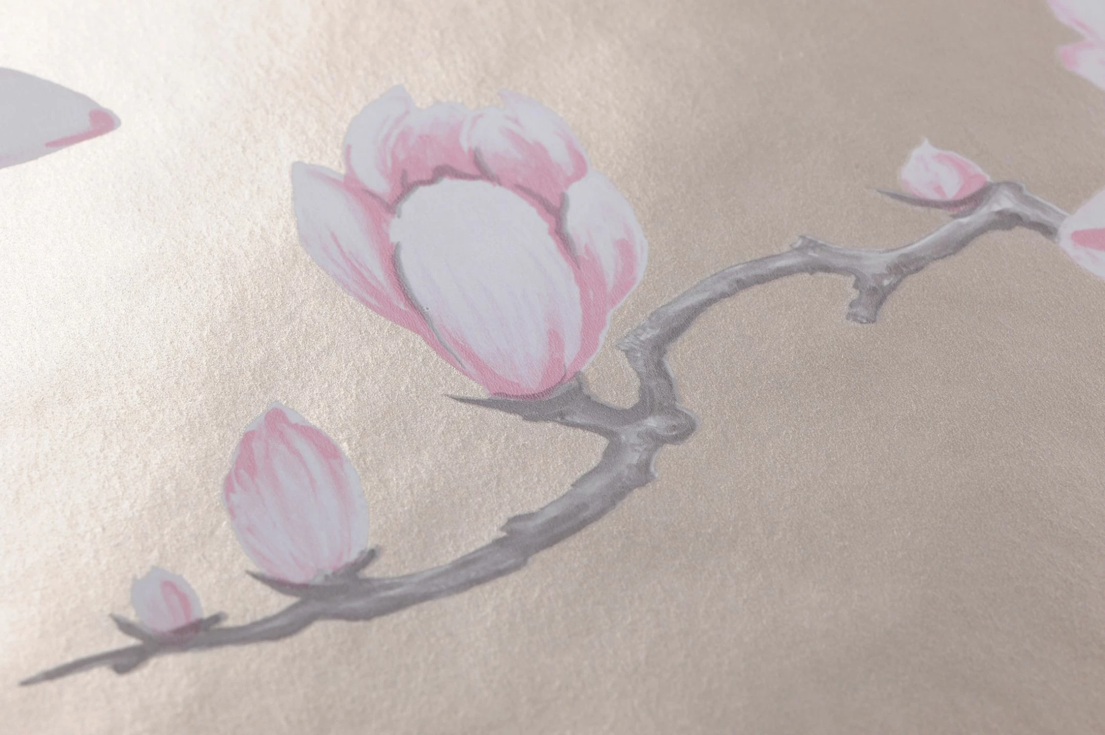 Die pralle Blütenkraft der Magnolie wird gerne mit weiblicher Schönheit und Fruchtbarkeit assoziiert. In dieser extravaganten Farbgebung, die Braun- und Rosatöne vereint, kommt die anmutige Schönheit uneingeschränkt zur Geltung. Der schimmernde Untergrund lässt die Blüten plastisch und sehr natürlich wirken.