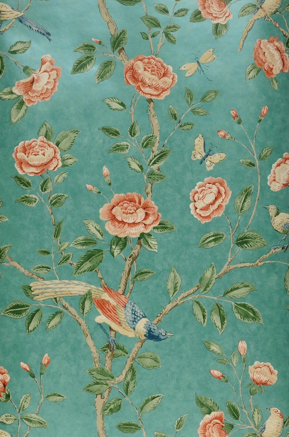 Korallenrot- und Cremetöne in verschiedenen Helligkeitsstufen, dazu Dunkelblau und Grüntöne herrschen vor in den Blüten, Blättern und dem Gefieder der farbenprächtigen Vögel und Schmetterlinge auf dieser Tapete. Der türkisfarbene Hintergrund hat eine leicht schimmernde Struktur und setzt sich so von den bunten Musterfarben ab. Es entsteht der Eindruck einer kostbaren historischen Illustration. Perfekt ergänzt wird die Tapete mit einer der passenden Wandfarben.
