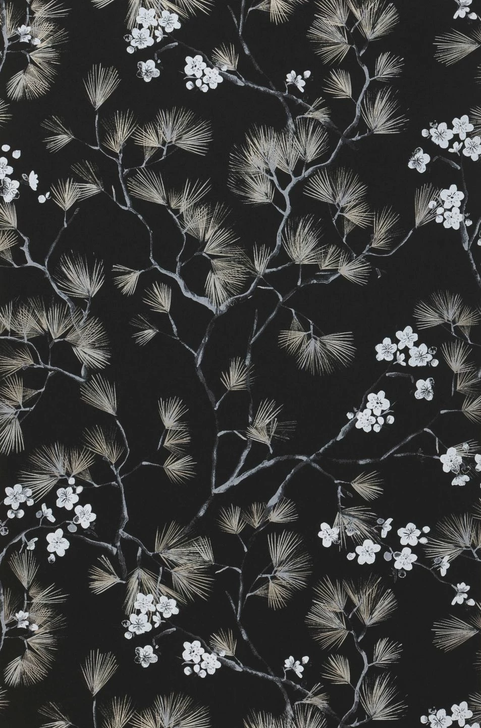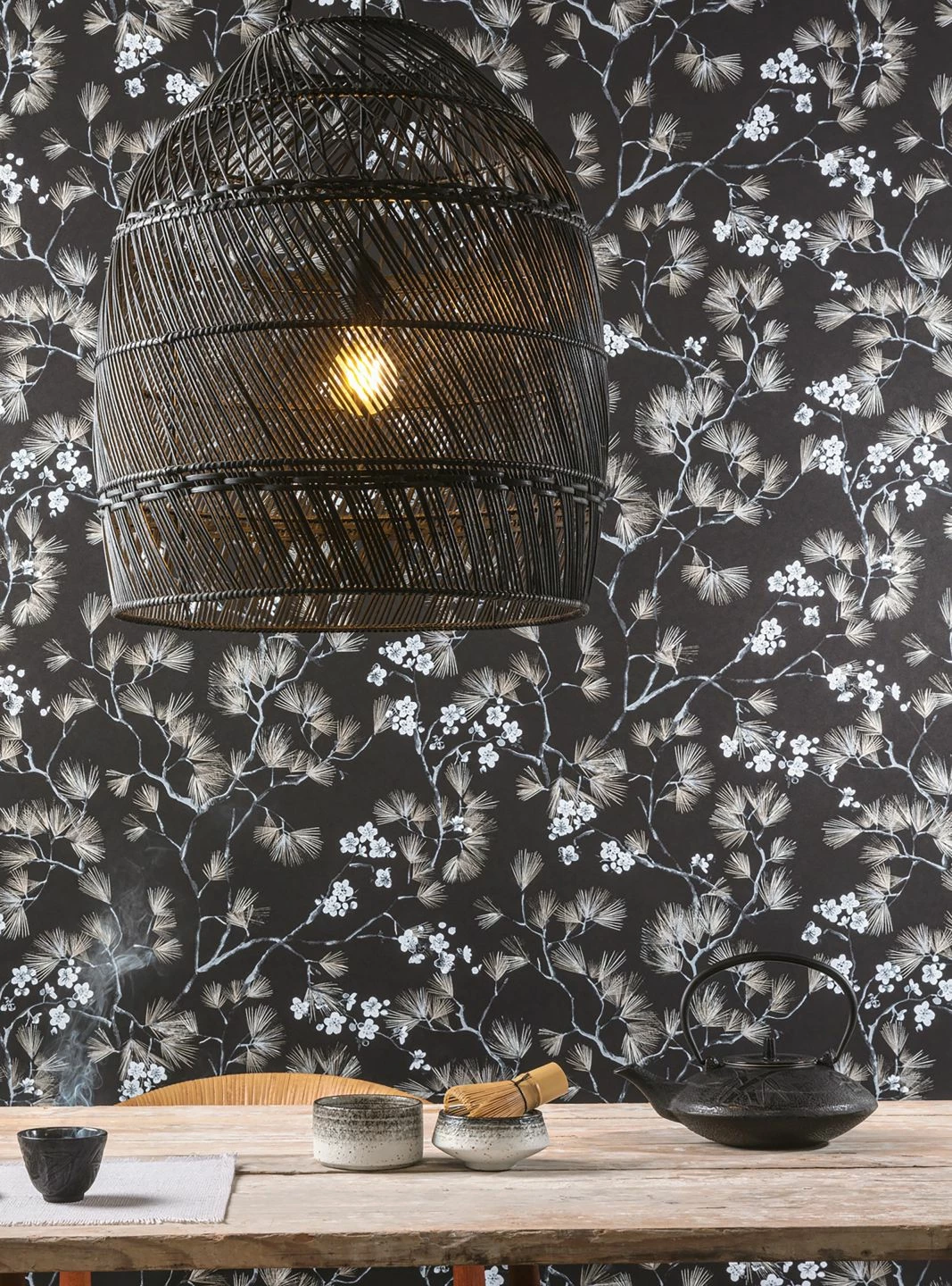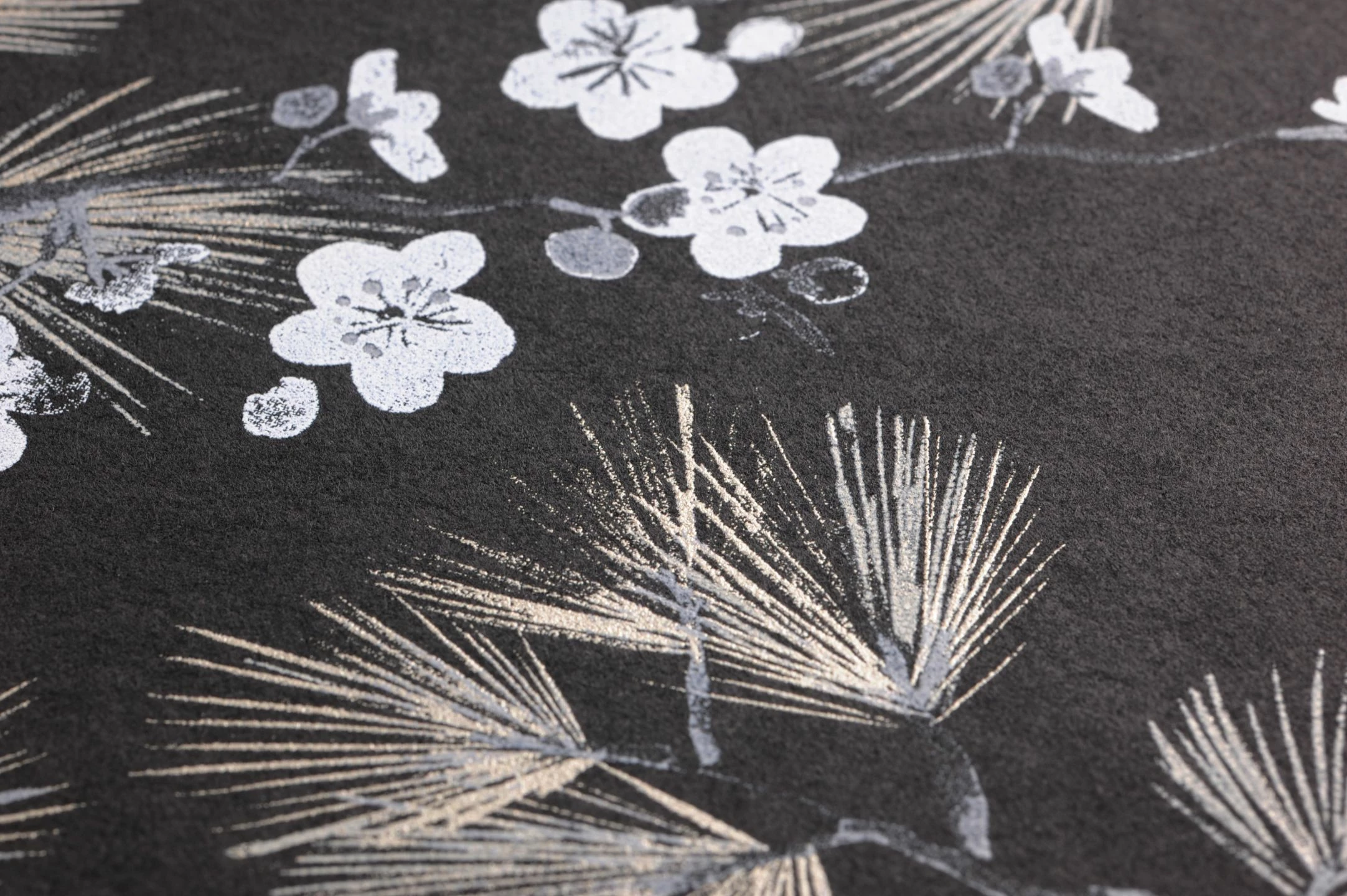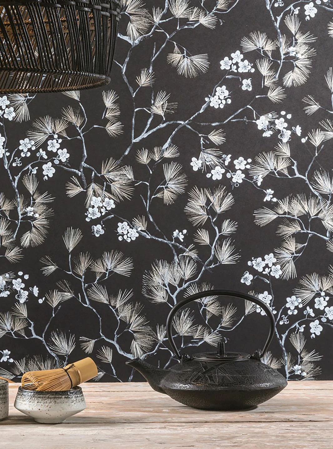 Eine besonders stilvolle Version des fernöstlichen Einrichtungsstils entsteht durch die Farbkombination dieser schicken Vliestapete. Die Nadelbaumzweige und Blüten auf dem schwarzen Grund sind allein in Weiß, hellen Grautönen und schimmerndem Silber gehalten. So ergibt sich der Eindruck einer künstlerischen Schwarzweißaufnahme. Gleichzeitig eröffnet sich eine Vielzahl von Kombinationsmöglichkeiten entweder mit Non-colours oder mit farbigen Akzenten.