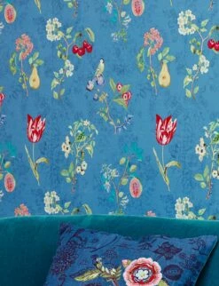 Die blaue Grundfarbe verleiht der floralen Mustertapete Mallorie einen außergewöhnlichen Charakter, von dem geheimnisvolle Kraft ausgeht. Die fantasievoll arrangierten Blumen, Früchte und Vögel in den Musterfarben Grün, Rot, Türkisblau, Violettblau bilden herrliche Kontraste. Gestalten Sie Romantik neu und modern mit dieser hochwertigen, waschbeständigen Design Tapete.