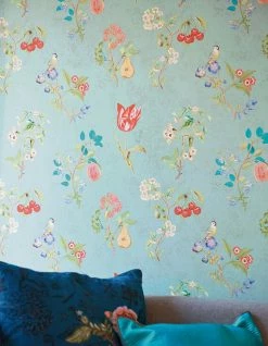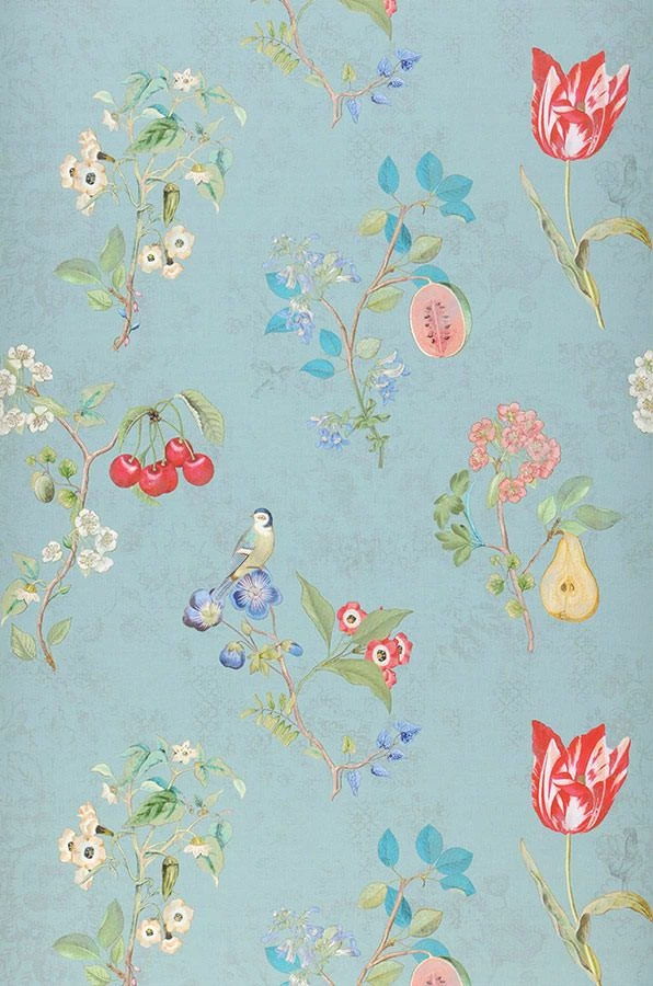 Wie ein schöner Frühlingstag, an dem die Natur zu neuem Leben erwacht – Designer Tapete Mallorie mit einem Mustermix aus feinen Früchten, filigranen Blüten und prallen Tulpen, zwischen denen sich auch liebliche Singvögel sehr wohl fühlen, regt die Fantasie an. Pastelltürkis als Grundfarbe sorgt für unbeschwerte Leichtigkeit mit extravaganter Note.