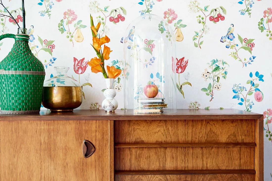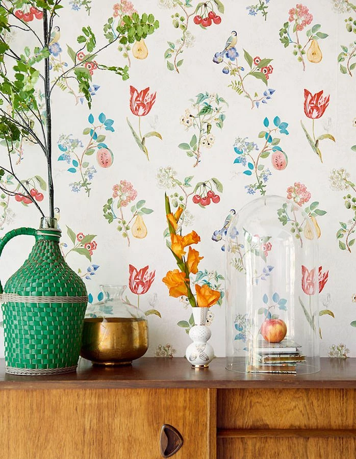 Fruchtig-blumig und mit reizenden Vöglein zeigt sich Design Tapete Mallorie mit cremeweißem Fond. Die Musterfarben in Grün, Rot, Türkisblau, Violettblau schaffen einen satten Kontrast und zaubern beschwingte Farbtupfer in den Raum. Die pflegeleichte Vliestapete bietet Romantik in heller Frische, die besonders attraktiv mit natürlichen Holzmöbeln zur Geltung kommt.