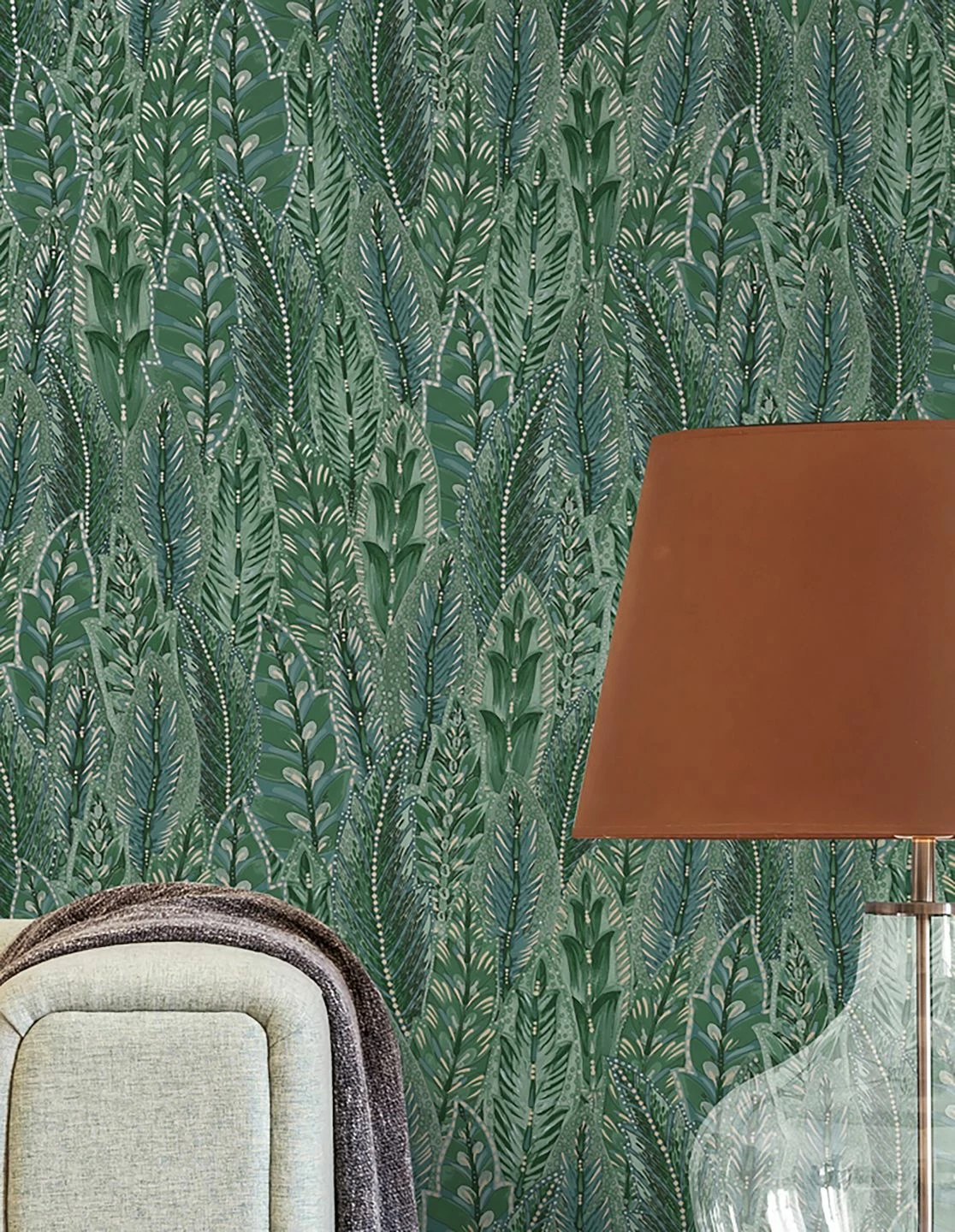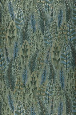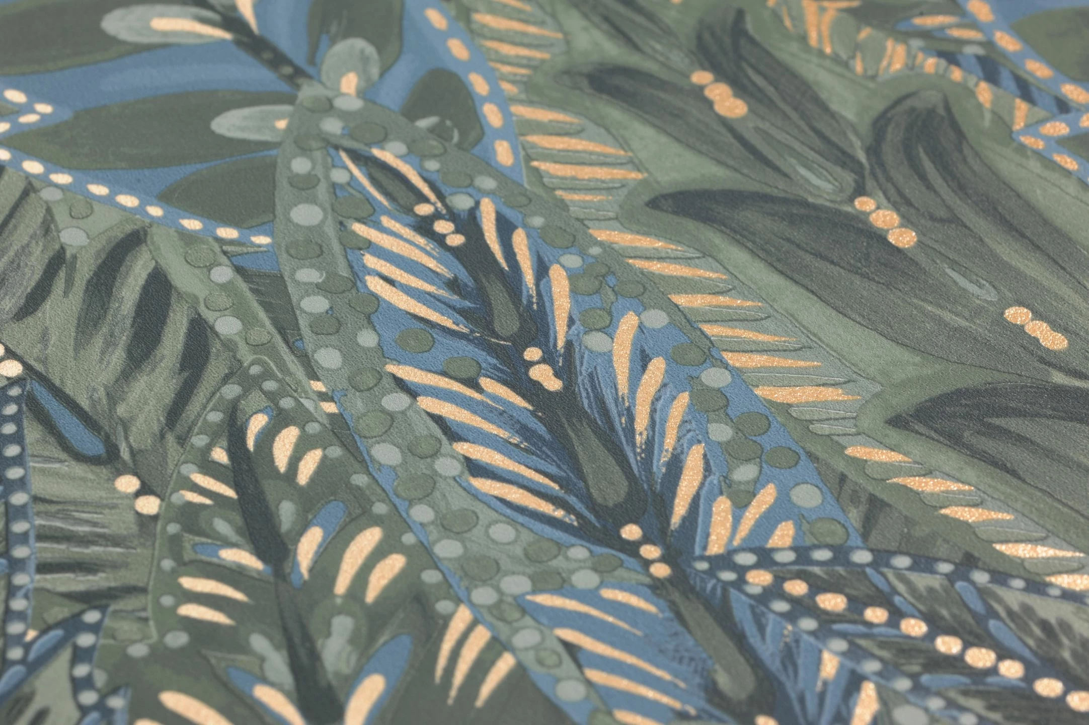 Blätter in den verschiedensten Grün- und Blautönen füllen die Vliestapete „Malu“ ganz aus. Dicht an dicht wachsen die Blattpflanzen wie in einem üppigen Dickicht. Die fein gemusterten Blätter gewinnen durch die Konzentration auf Grüntöne und dazu passendes Azurblau einen ästhetischen Zusammenhalt. Für schimmernde Highlights sorgt schimmerndes Gold. Die botanische Tapete strahlt Ruhe und Geborgenheit aus.