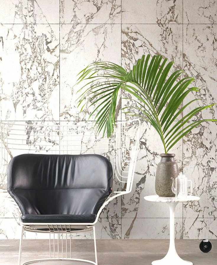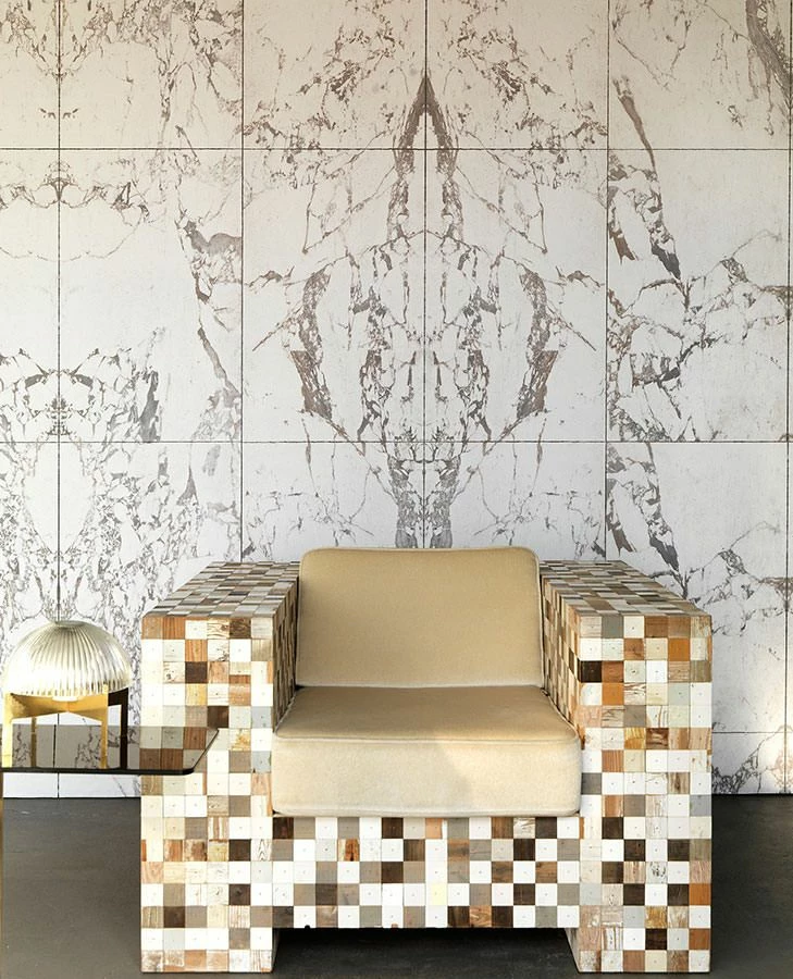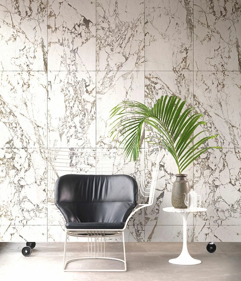 Schauen Sie genau hin und erkennen Sie die besonderen Bilder, welche die Marmorstrukturen in Braunweiss, Graubraun, Grünbraun hervorbringen. Menschliche Figuren, Fabeltiere, Ornamente zeigen sich, wenn der Fantasie freien Lauf gelassen wird. Die künstlerisch wertvolle NLXL Tapete setzt die weißen Marmor-Imitat-Fliesen täuschend echt und sehr plastisch in Szene.