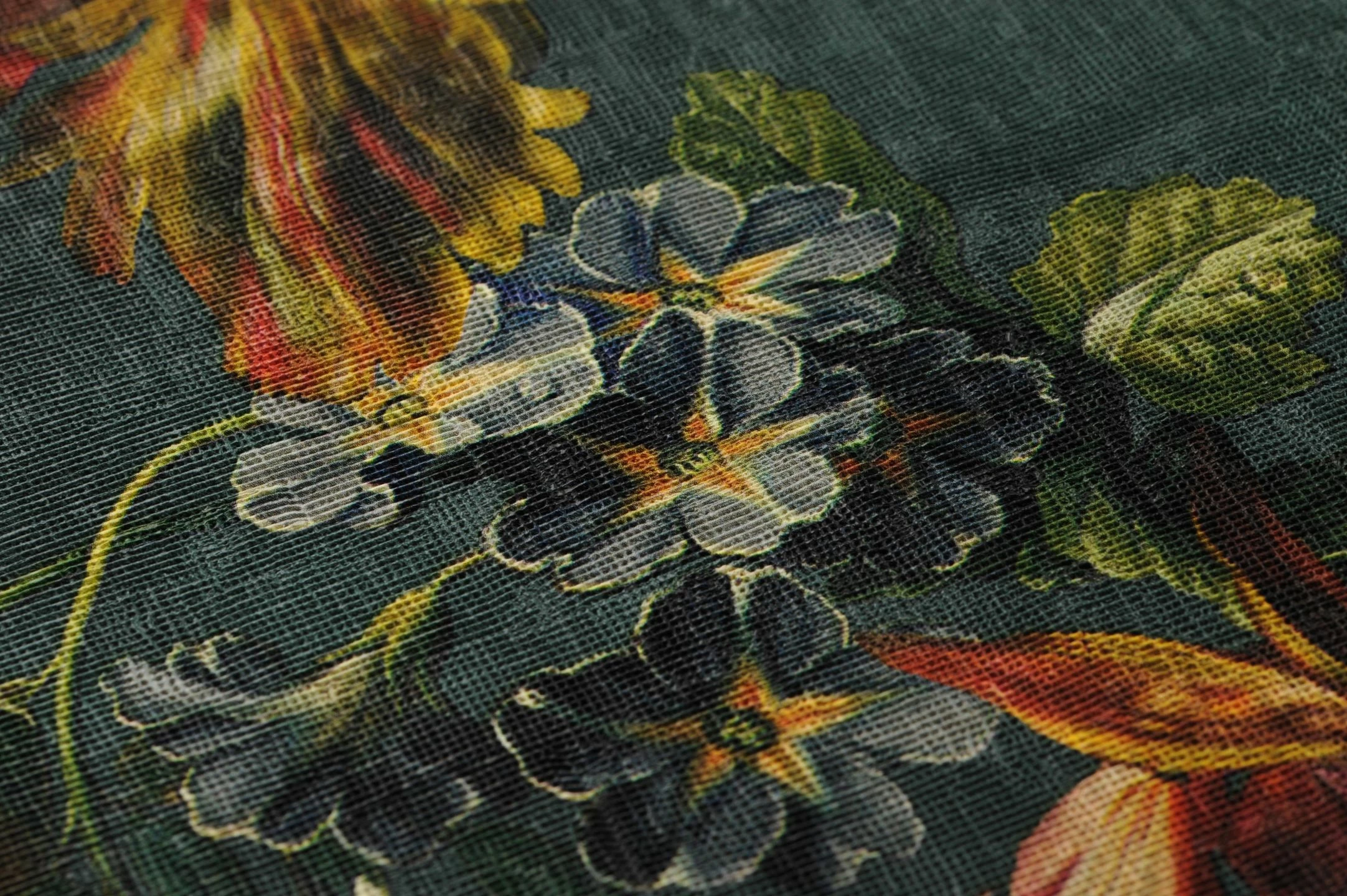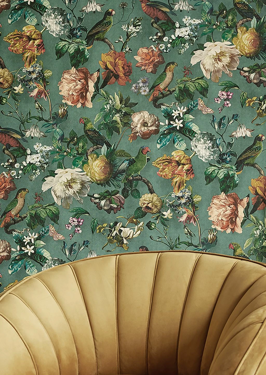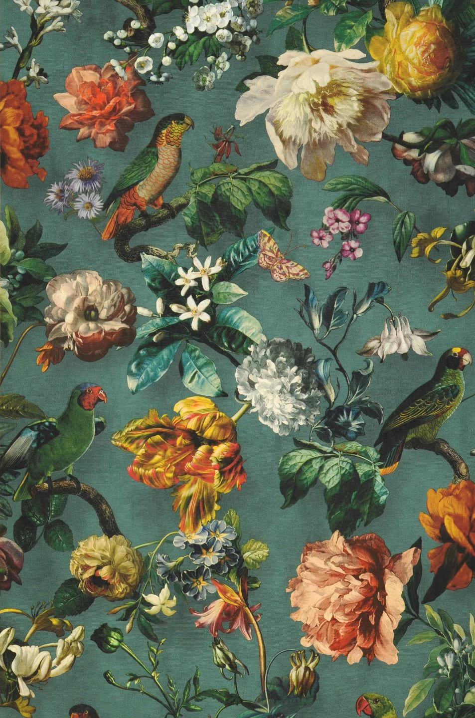 Große Blüten, die so plastisch wirken, als könne man ihre zarten Blätter berühren, bunte Vögel und Schmetterlinge, Zweige mit kräftigen grünen Blättern auf kieferngrünem Grund – die kunstvollen Illustrationen der Vliestapete „Margarete“ wirken wie ein kostbares Gemälde. Durch die textilähnliche Struktur der Vinyloberfläche wird dieser Eindruck noch verstärkt. Gleichzeitig ist das Material hoch waschbeständig und damit sogar für Ihr Badezimmer geeignet.