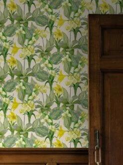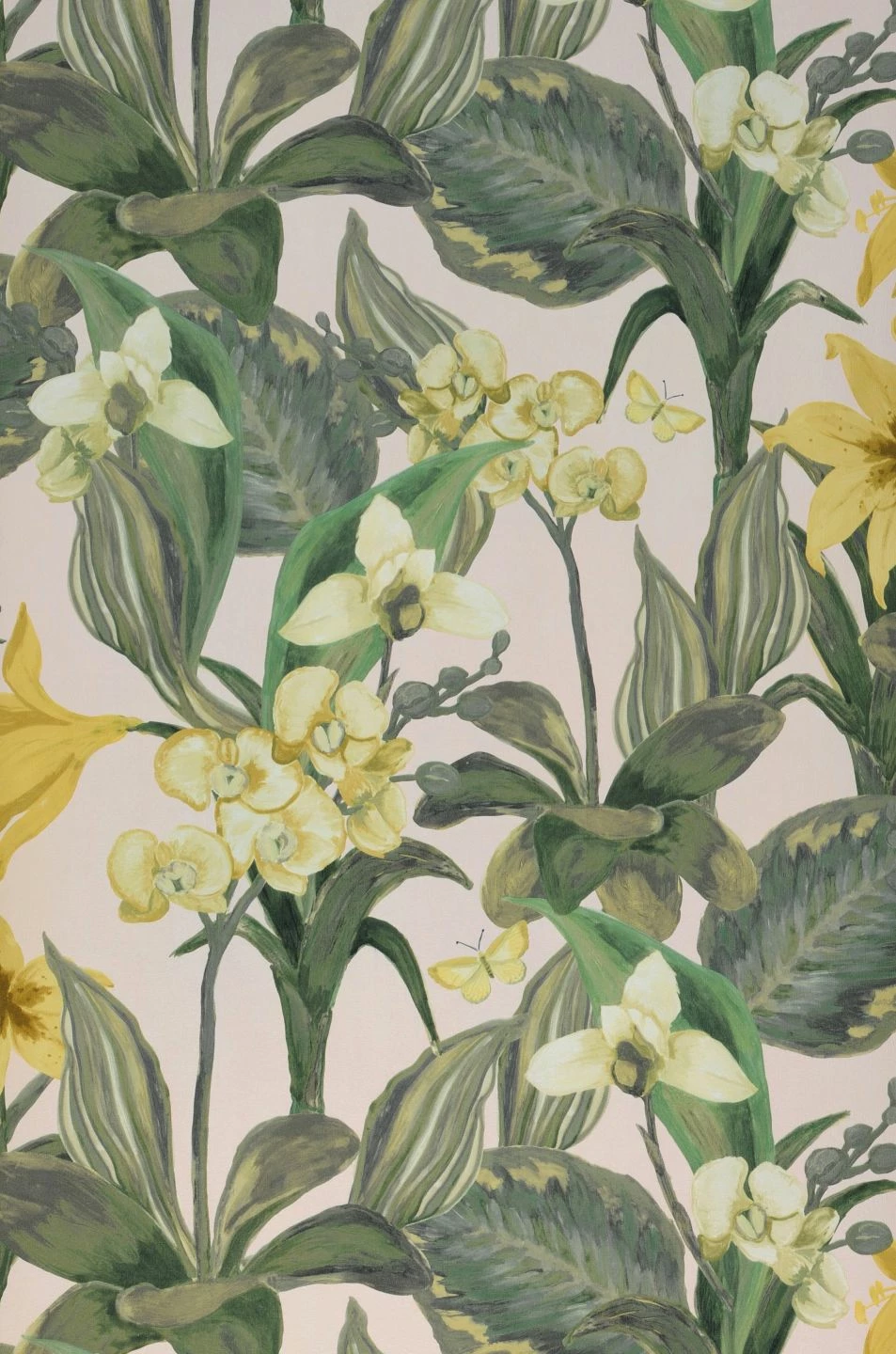 Prachtvolle Orchideen mit ihren ausgeprägten Blütenformen bilden das opulente Muster der Vliestapete Marianne. In frischen Gelbtönen auf dem cremeweißen Untergrund leuchten sie zwischen den kunstvoll gemusterten Blättern in dunkleren Grüntönen hervor. Kleine Schmetterlinge bilden schöne Details zwischen den großen Blüten. Mit seiner Leuchtkraft und seiner positiven Ausstrahlung macht das Blumenmuster Ihren Raum einladend und sonnig.