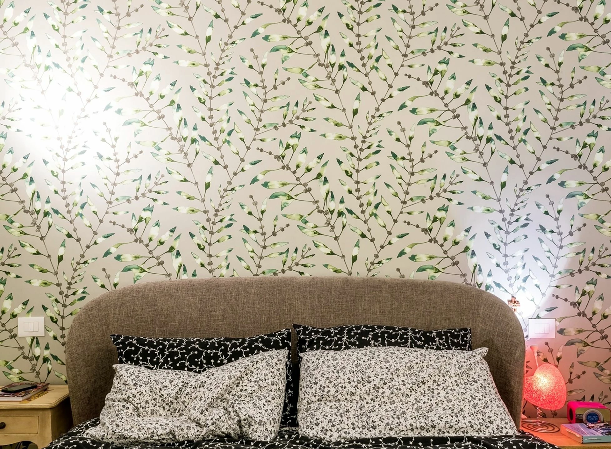 Farbabstufungen, Verläufe, Hell-Dunkel-Kontraste lassen die grünen Blätter an umbragrauen Zweigen auf Design Tapete Mathea täuschend echt erscheinen. Der aluminiumweiße Tapetengrund verleiht das Plus an magischer Tiefe. Lassen Sie sich umgarnen von dieser natürlichen Schönheit, die sich kunstvoll Ihrer Raumgestaltung anpasst.