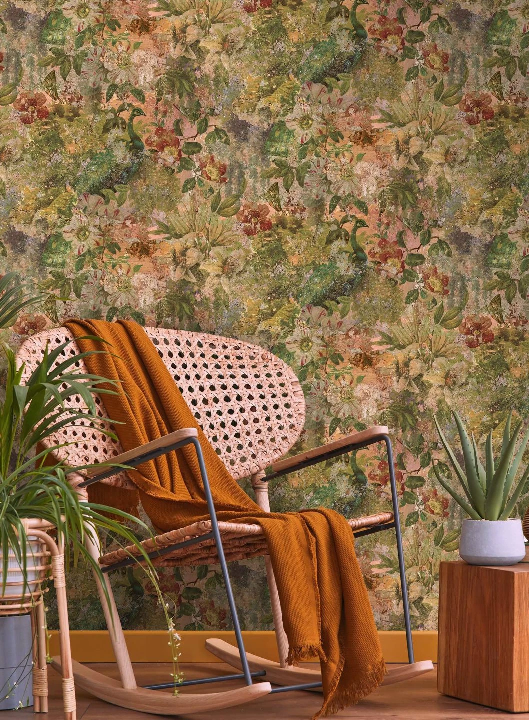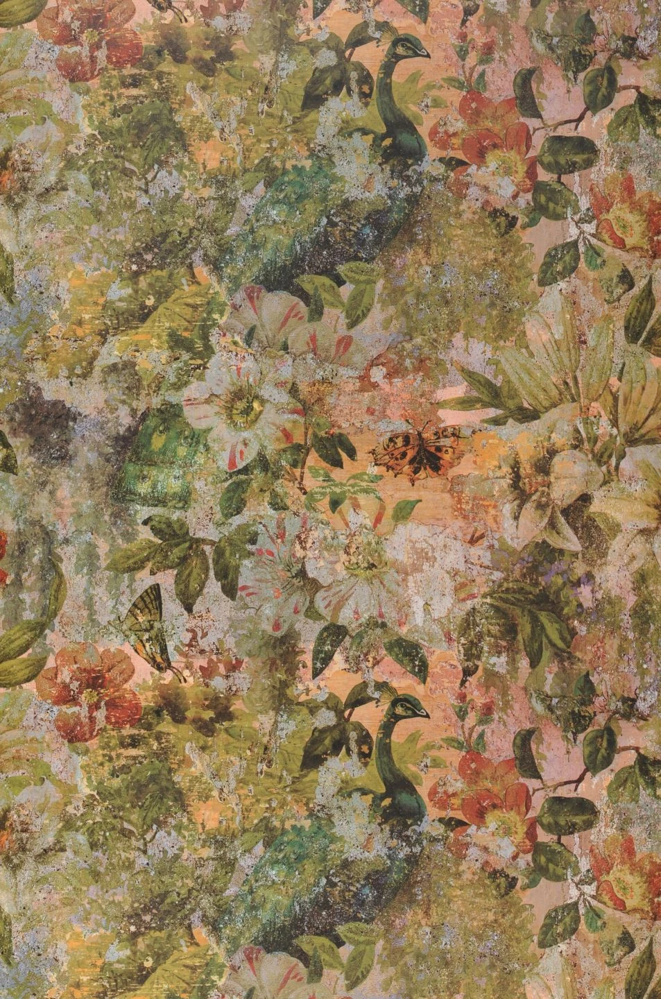 Eine Tapete wie ein kostbares altehrwürdiges Gemälde. Matupi zeigt Pfauen und Schmetterlinge inmitten prächtig blühender mediterraner Blumen. Die perfekt zueinander passenden Farben und die Optik, die Spuren hohen Alters zu zeigen scheint, geben dem Design die Anmutung eines antiken Wandschmucks und machen es einzigartig. Als außergewöhnliche Ergänzung des Shabby Chic gibt die Tapete diesem Stil einen Touch von romantischer Farbigkeit.