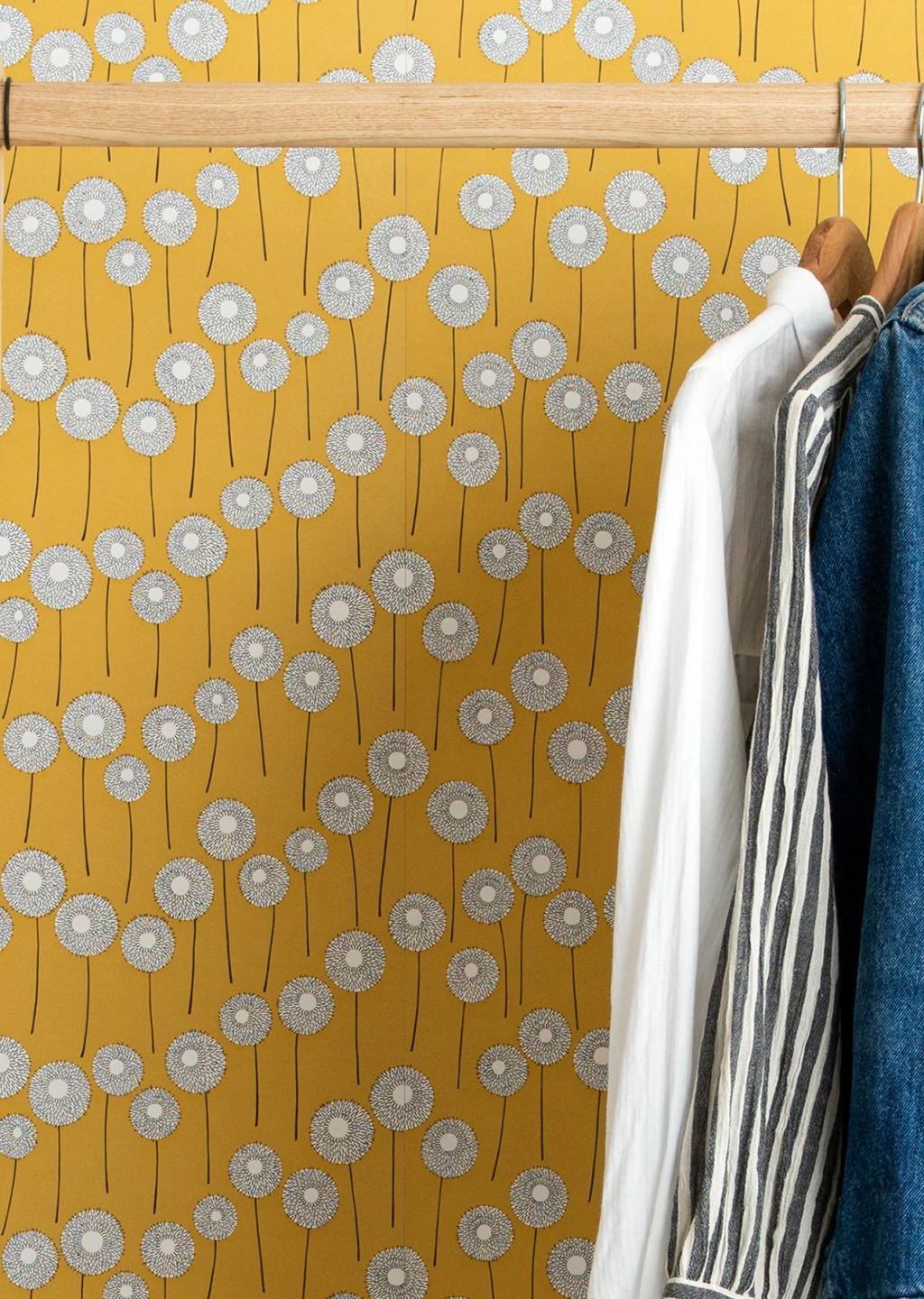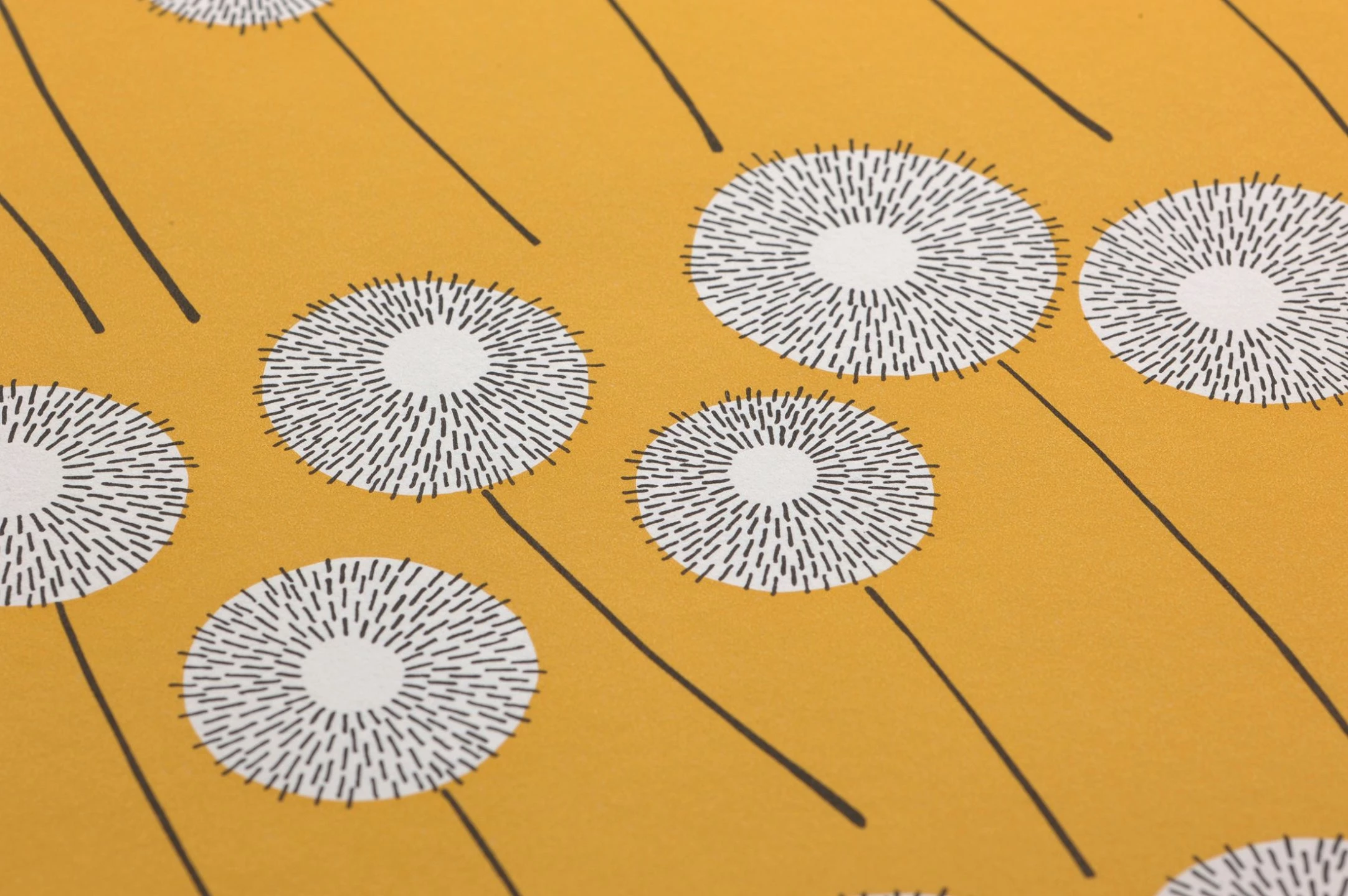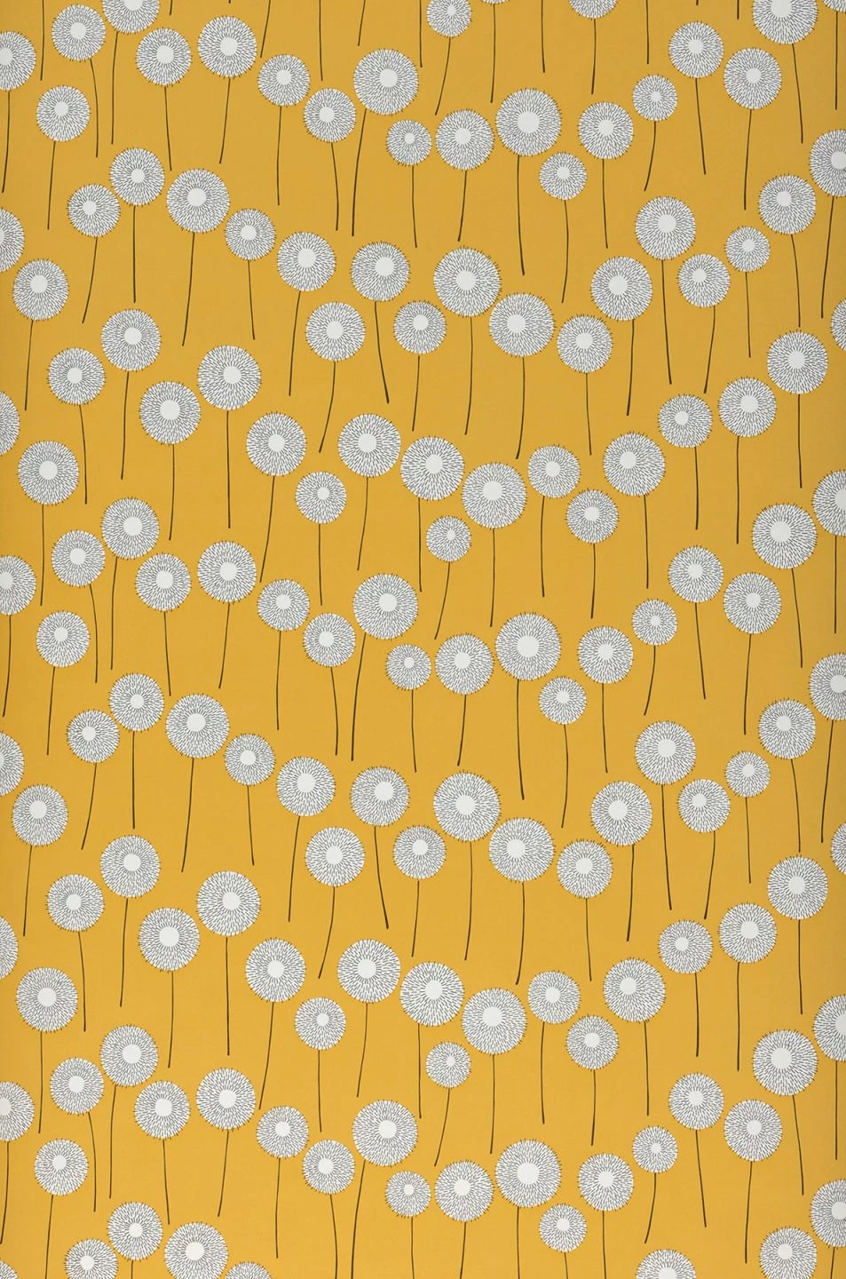 Stilisierte schwarzweiße Blüten, nur angedeutet durch zarte Striche, auf einem Untergrund, dessen kräftig leuchtendes Gelb der Farbe des blühenden Ginsters gleicht. Mit einfachen graphischen Mitteln entsteht der Eindruck von Blumen, deren Blüten sich in verschiedene Richtungen der Sonne entgegen wenden. Mit ihrem leuchtenden Gelb bringt die Tapete das Sonnenlicht in Ihren vier Wänden auf besondere Weise zur Geltung.