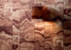 Marmorstrukturen in Brauntönen und Bronzeschimmer erinnern als modernes Mosaik an Holz und Bäume mit Jahresringen. Wie ein leuchtendes Flammenspiel im Kamin erfüllt auch die extravagante Marmorimitat Tapete den Raum mit wohliger Behaglichkeit und knisternder Spannung. Sehr wirkungsvoll zu gehobenen Vintage-Styles oder für den extrovertierten Kolonialstil.