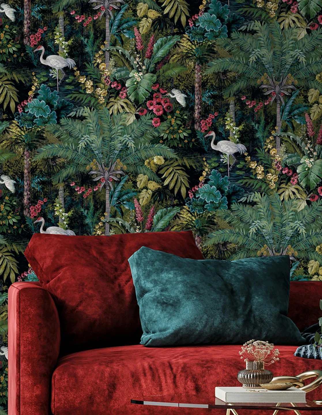 Geheimnisvoll und voller Leben ist der tropische Dschungel, der auf Vliestapete Melora abgebildet ist. Auf dem dunklen Grund entsteht zwischen den opulenten Blattpflanzen in tiefen Blau- und Grüntönen interessante räumliche Tiefe. Dazwischen leuchten die Blüten in hellen Rot- und Gelbtönen und die großen weißen Kraniche hervor. Besonders raffiniert: Das Design spielt geschickt mit Vorder- und Hintergrund, so dass eine fast magische Welt entsteht.