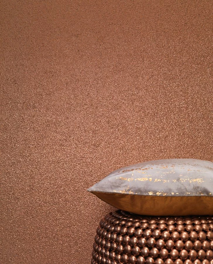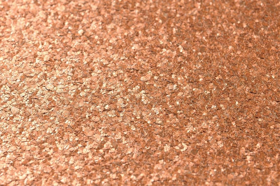 Die leicht raue Oberfläche aus aufgeklebten Micasteinchen glänzt und funkelt im Licht. Das Material aus Scheibchen von natürlich vorkommendem Glimmer strahlt die beruhigende Festigkeit von Gestein aus und wirkt gleichzeitig im einfallenden Licht leicht und locker. Der warm leuchtende Kupferton der Tapete wird durch die kleinen, unregelmäßigen Oberflächen der Gesteinsbröckchen aufgebrochen. Zum fernöstlichen Einrichtungsstil eine schöne Vollendung.