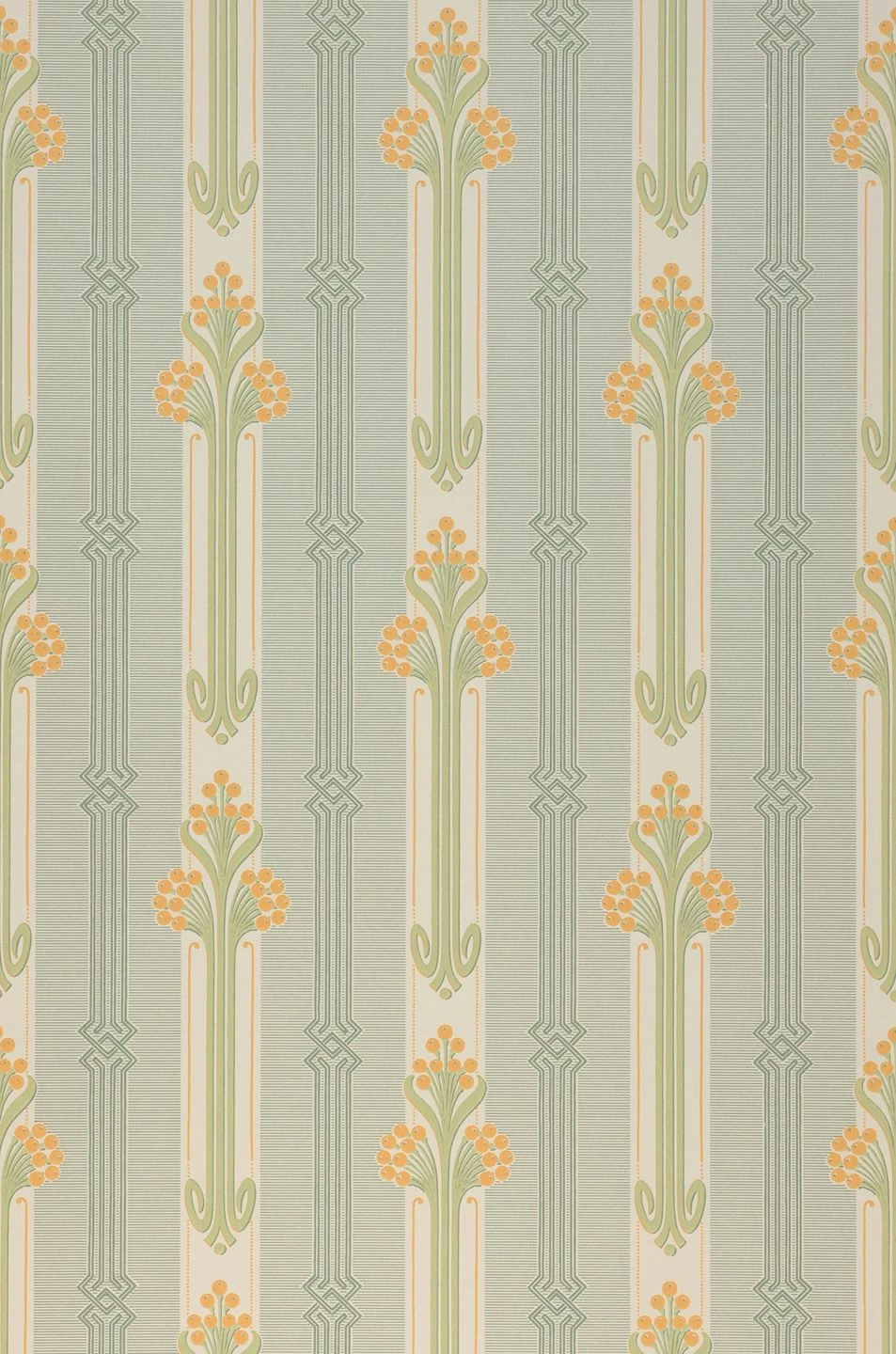 Safrangelb mit Grünnuancen auf cremeweißem Fond bringt das florale Jugendstilmuster in ein strahlendes Konzept. Die klassische Mustertapete steht Vintage-Einrichtungskonzepten sehr gut zu Gesicht, insbesondere, wenn antike Stilmöbel aus dunklem Echtholz mit von der Partie sind.