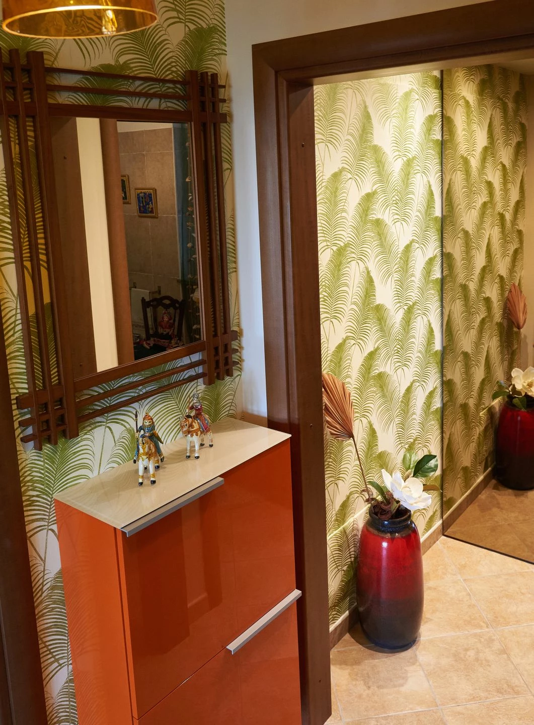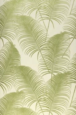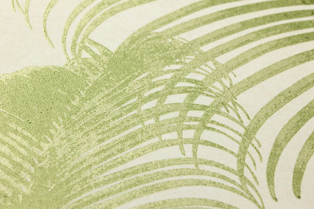 Die locker angeordneten Palmenzweige verbreiten ein luftiges Ambiente. Die Grundfarbe Cremeweiß dieser Vliestapete schmücken Blätter in Farngrün-Schimmer.