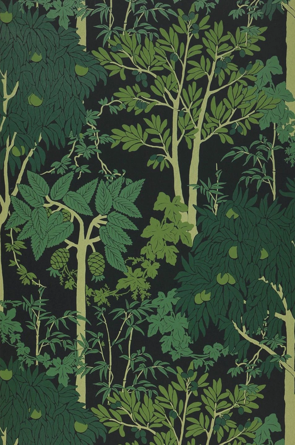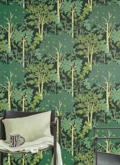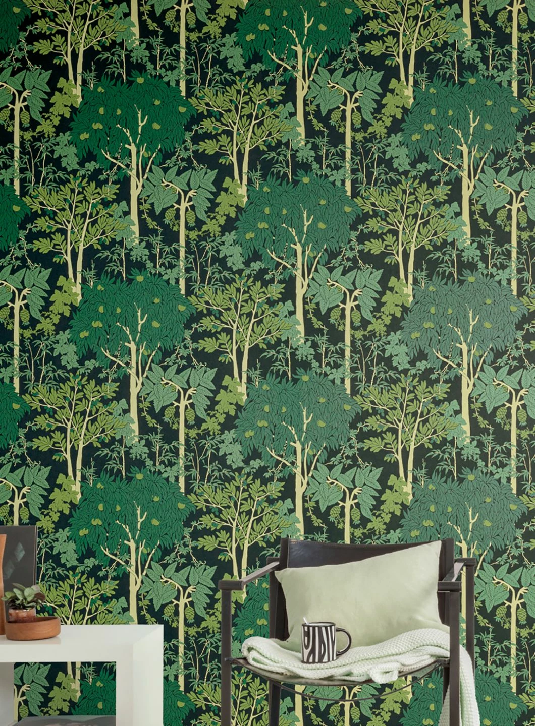 Auf dem dunklen Untergrund dieser Vliestapete wachsen Bäume und Büsche, Ranken und Zweige, verschieden geformte Blätter und Früchte. Der Wald ist ausschließlich in unterschiedlichen Grüntönen gestaltet und entfaltet dadurch eine beruhigende, optimistische Raumwirkung. Die kräftigen Farben vertragen sich gut mit dunklen Möbeln, Cremetönen oder Einrichtungselementen in passenden Nuancen von Grün.