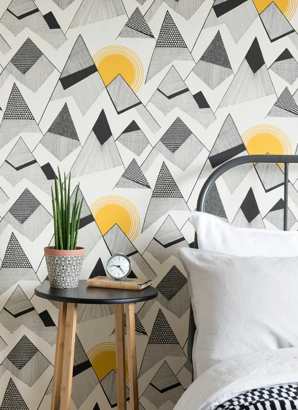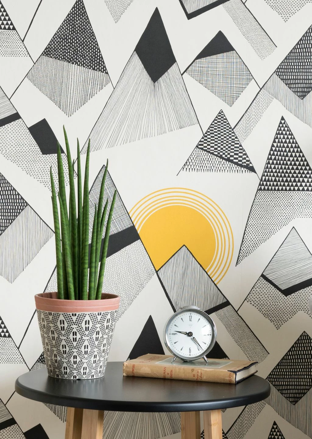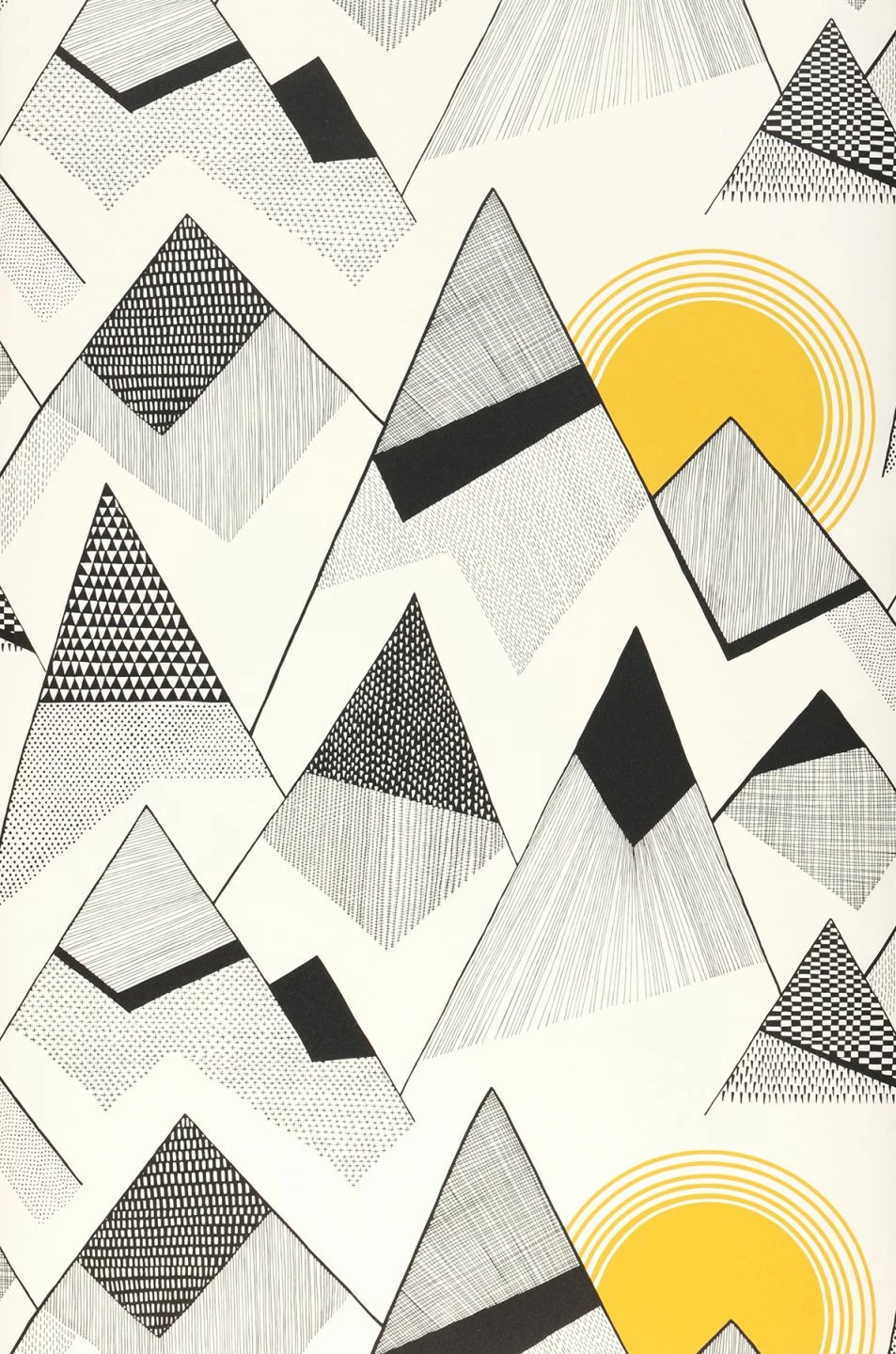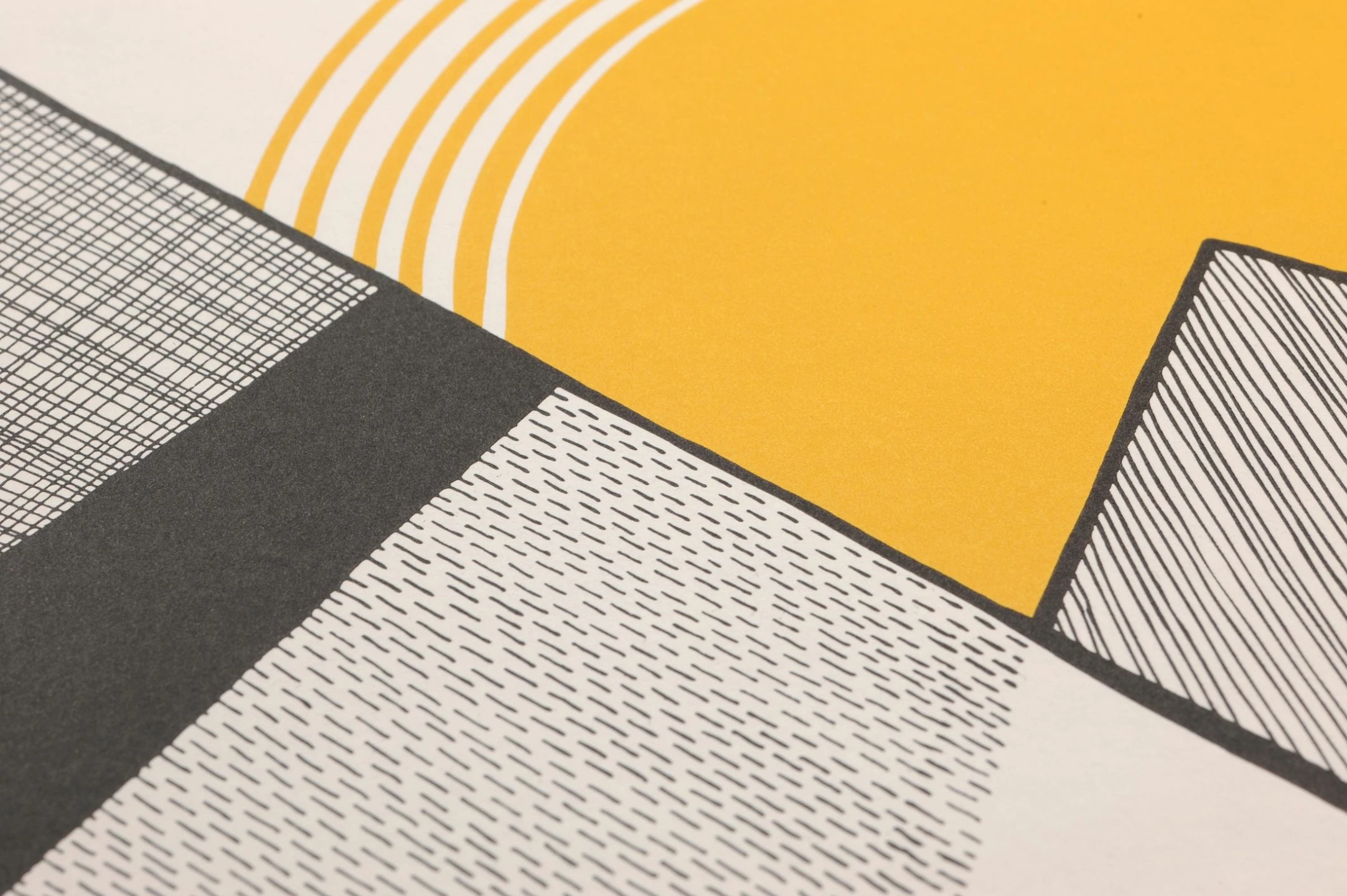 Eine abstrakte schwarzweiße Gebirgslandschaft entsteht aus einfachen geometrischen Formen. Die spitzen Dreiecke der Berge sind auf verschiedene Weise schraffiert und gemustert. Fast könnten sie als Kritzeleien auf einem Notizblock entstanden sein, doch sie setzen sich zu einem Eindruck der räumlichen Tiefe wie bei hintereinander aufragenden Bergketten zusammen. Das Schwarzweiß des Musters wird nur vom leuchtenden Gelb der Sonne unterbrochen, die strahlend zwischen den Bergen aufgeht.