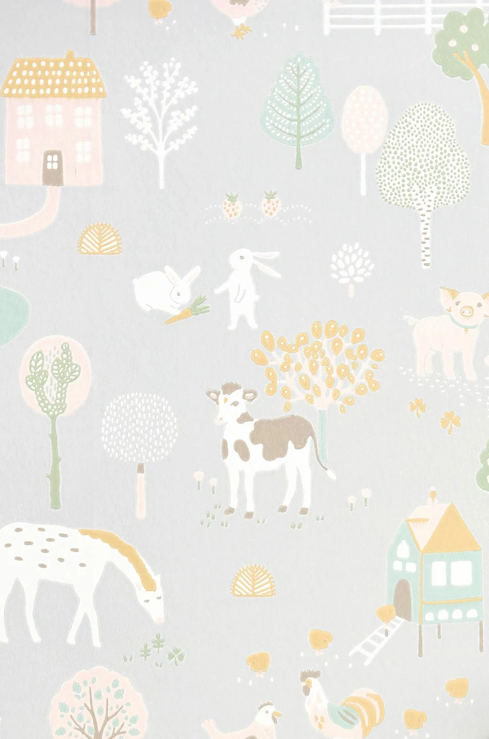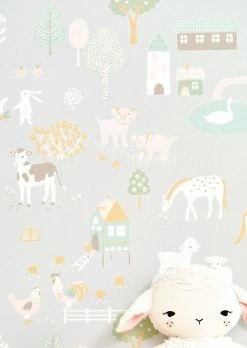 Wie auf einem richtigen Bauernhof gibt es auf dieser Kindertapete aus dem Hause Majvillan viel zu entdecken: Kühe und Pferde, Schweine, Kaninchen und Hühner, Lämmer und sogar Schwäne tummeln sich liebevoll gezeichnet zwischen den Hofgebäuden und den blühenden Bäumen. Das kindgerechte Design und die zarten Farben auf weißgrauem Untergrund sorgen für eine helle, freundliche Stimmung im Kinderzimmer.