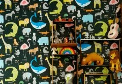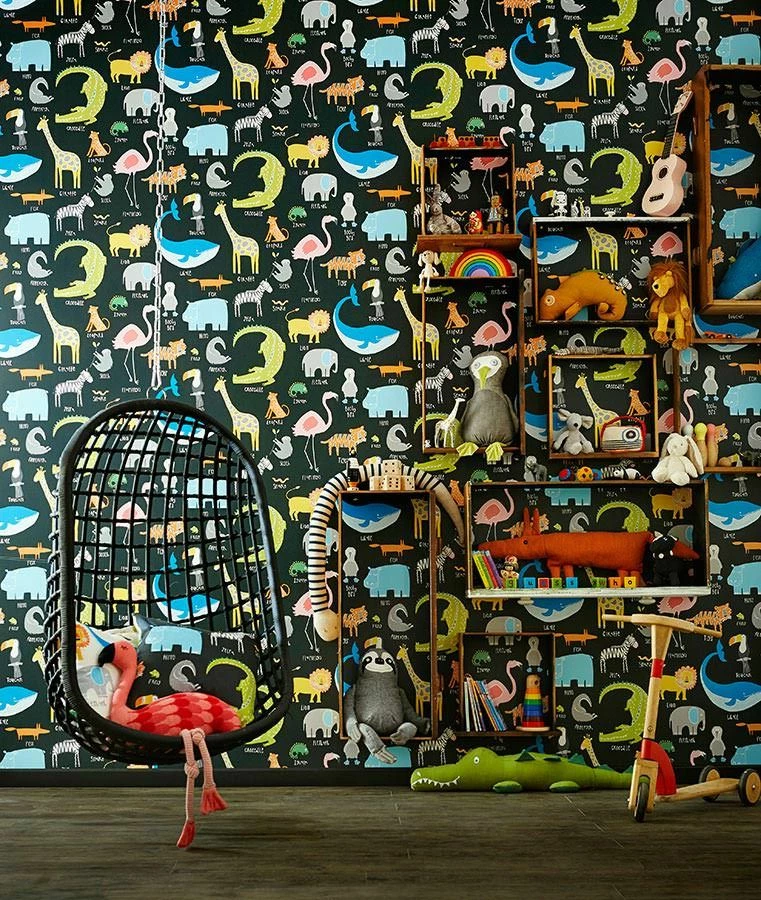 Auf dieser Tapete gibt es viel zu bestaunen. Löwen, Flamingos, Tiger, Giraffen, Zebras und viele andere Tiere begleiten Ihr Kind durch den Tag. Kindgerecht gemalt, mit freundlichen Gesichtern wie in einem liebevoll dekorierten Bilderbuch, leuchten ihre Farben auf dem neutralen dunklen Grund besonders strahlend. Für alle kleinen Tierfreunde bietet die farbenfrohe Papiertapete Dekoration, Unterhaltung und Information zugleich.