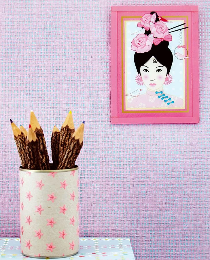 Ein grobmaschiges Gewebe aus hellvioletten Papierstreifen auf einem leicht schimmernden, türkisblauen Grund gibt dieser Tapete ihren ausgeprägten Charakter. Die zarten Farben verleihen Ihrem Raum eine sanfte Ästhetik, die Sie mit Möbeln in den verwendeten Farbtönen oder in Weiß noch unterstreichen. Der Kontrast zwischen Geflecht und Trägermaterial betont die Gewebestruktur und steuert einen Eindruck von räumlicher Tiefe bei.