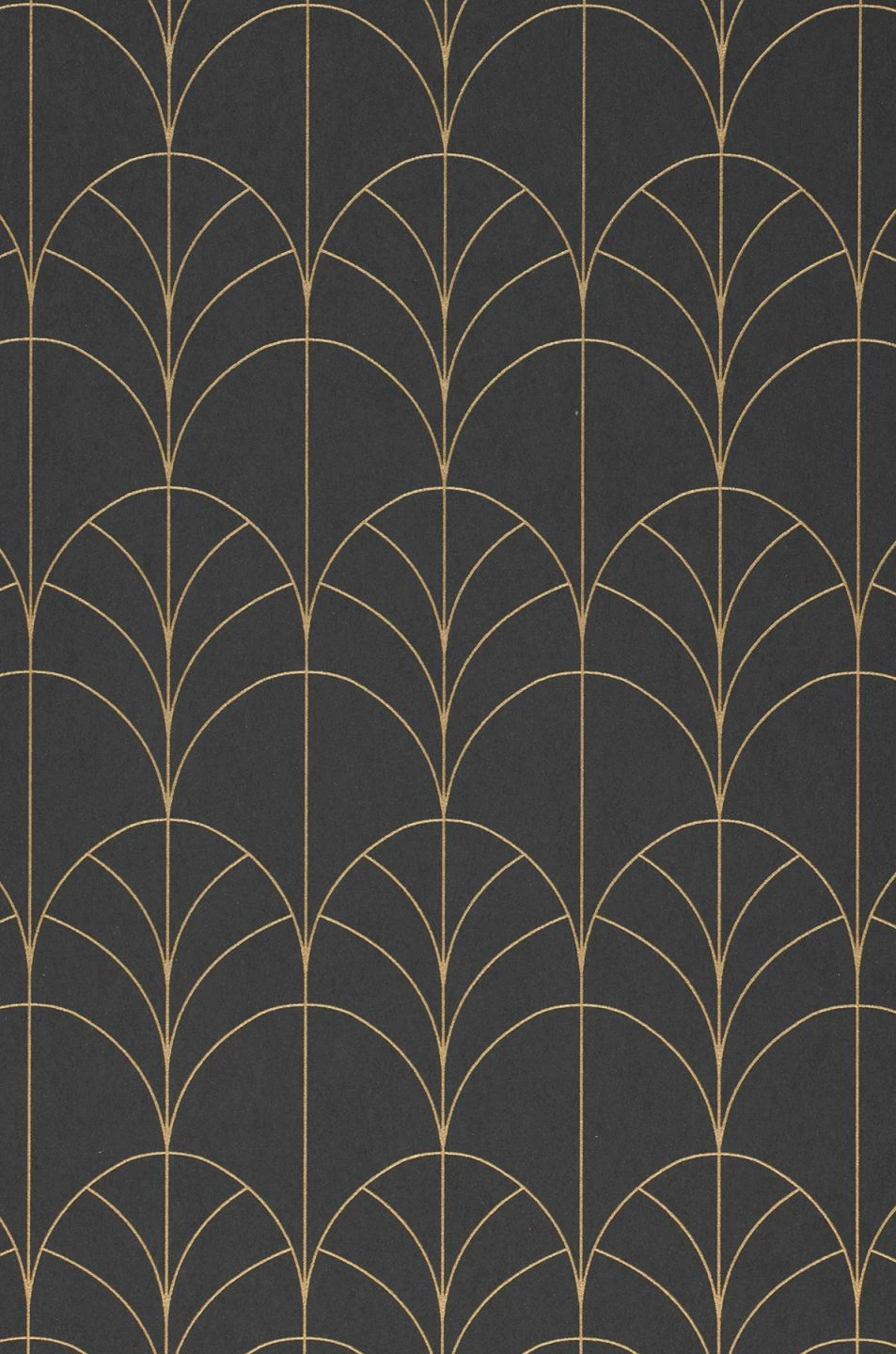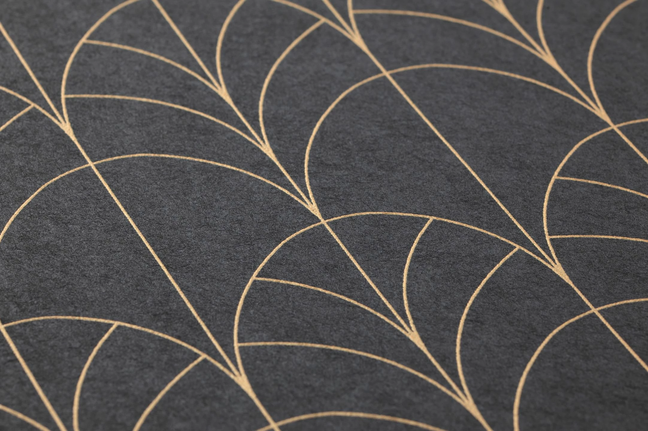 In dunklen Farben gestaltete Räume vermitteln behagliche Eleganz und zeigen mitunter auch sehr exotische Nuancen. Glamouröse Exotik ist das Stichwort für diese Designtapete im Art Deco Stil, die sich nach Lust und Laune frei entfalten kann. Schokoladiges Schiefergrau setzt das schimmernde Gelbgold des Musters perfekt in Szene.