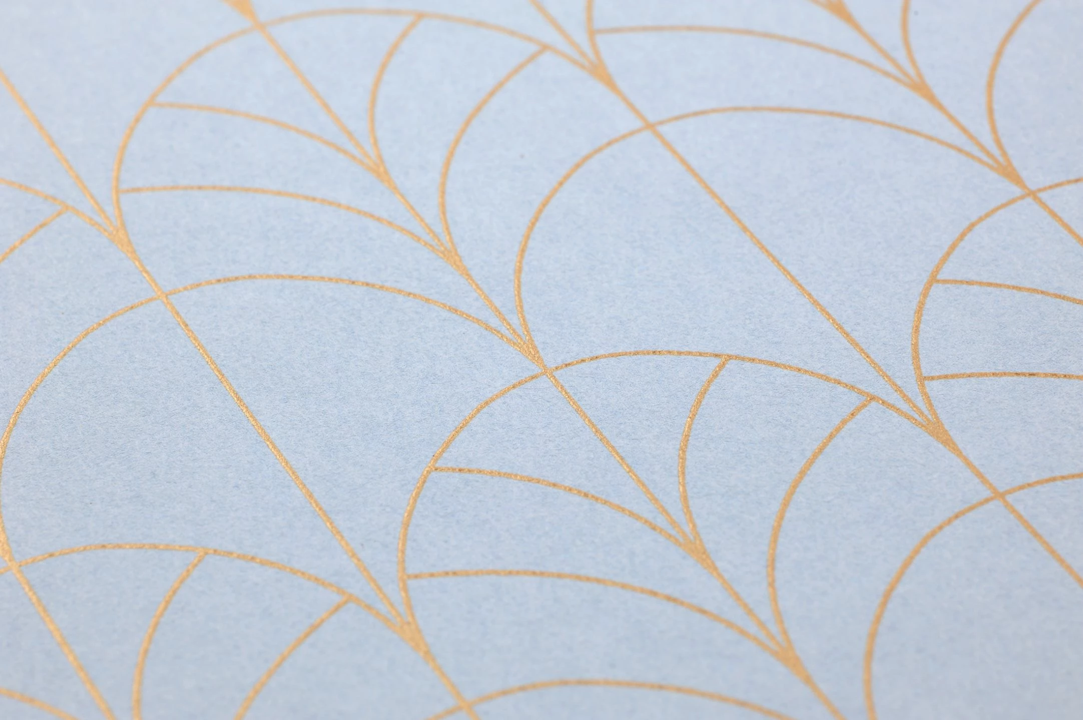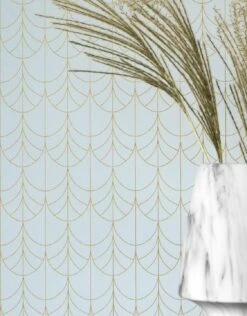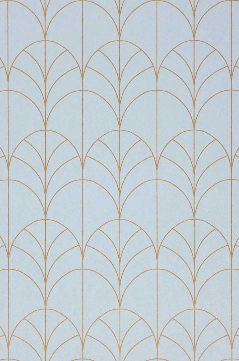Art Deco Bögen mit feiner Linienführung in schimmerndem Perlgold heben sich sanft vom zartblauen Tapetengrund ab. Das delikate Muster mit seiner tiefgründigen Unregelmäßigkeit punktet mit raffinierter Eleganz. Durch die waschbeständige Oberfläche bleibt die reine Schönheit der Designtapete gewährleistet.