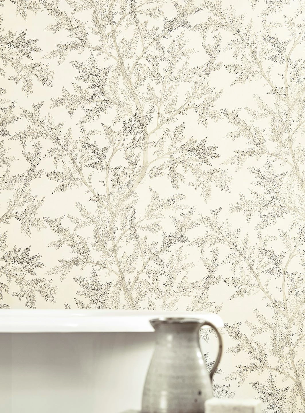 An zarten, wie mit Aquarellfarbe gemalten Ästen und Zweigen sitzen kleine, zierliche Blätter, die mit feinen Pinseltupfern angedeutet sind. Helle Grautöne und schimmerndes Silber auf dem cremeweißen Grund tragen zu der luftigen, leichten Wirkung dieser Vliestapete bei und erzeugen wie glänzendes Laub leichte Lichtreflexe. Mit hellen, grauen oder Holzmöbeln entfaltet die Tapete ihre ganze Eleganz.